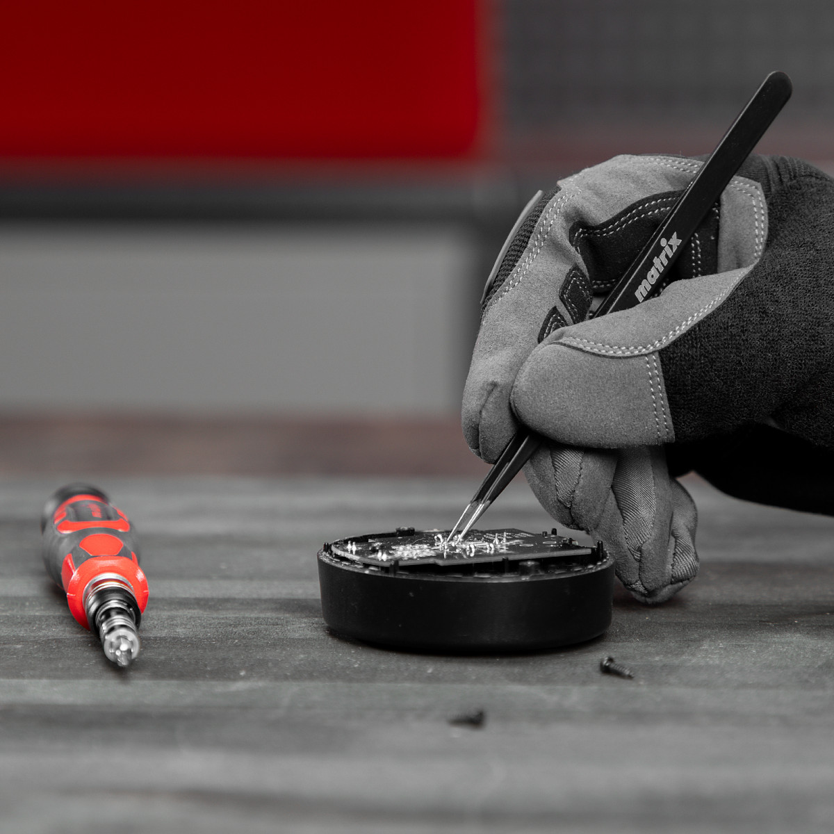 Набор для точных работ Matrix 13569 включает в себя 93 биты, 9 торцевых головок, телескопический и гибкий удлинители, намагничиватель-размагничиватель бит, отвертку и пинцет с защитным колпачком. С его помощью можно отремонтировать очки, игрушки, портативную и бытовую технику и т.д. Выдвижной стержень, гибкий удлинитель и пинцет позволяют работать с мелкими деталями в углублениях и труднодоступных местах.