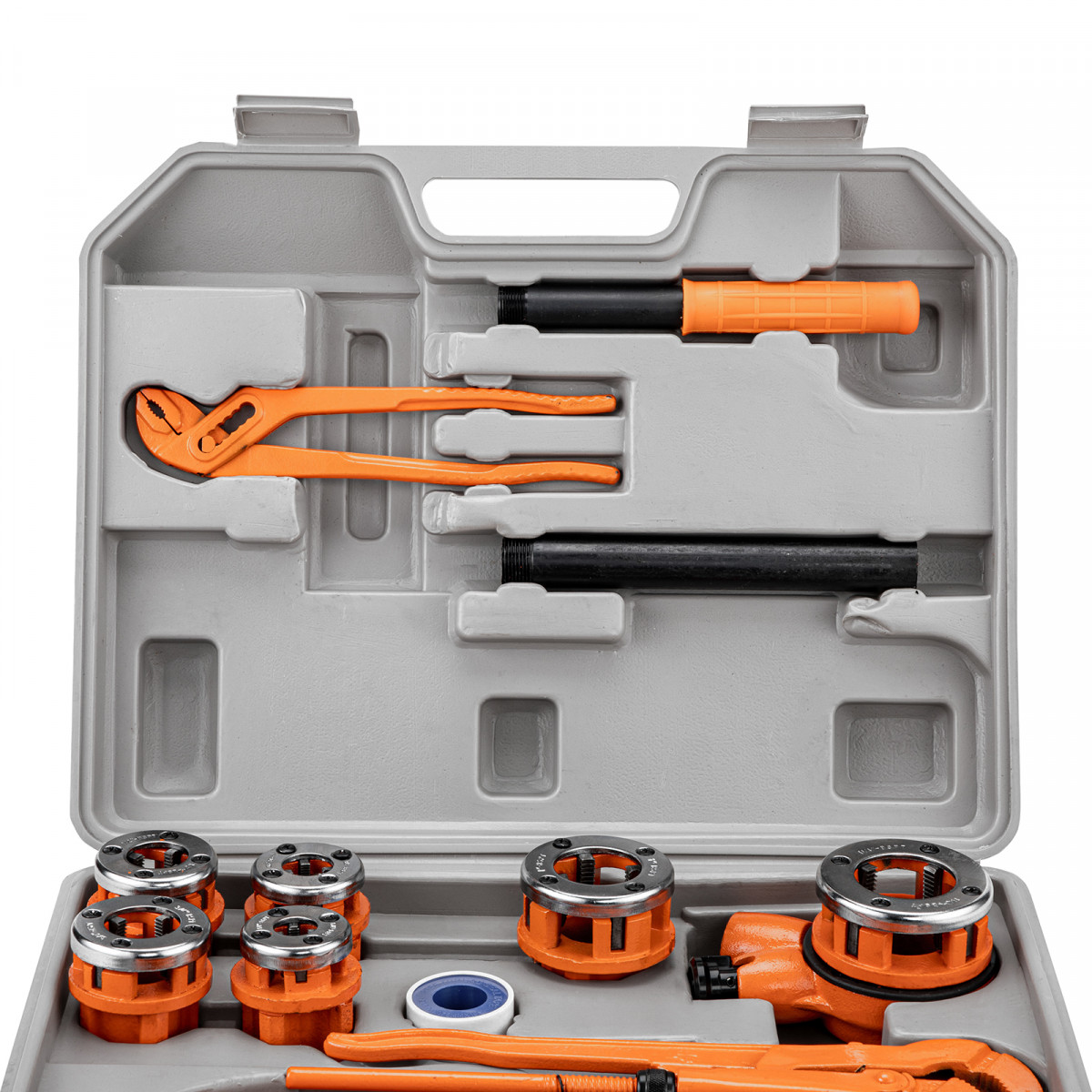 Набор для трубных работ Sparta 773345, состоящий из 13 предметов, пригодится частному мастеру. С его помощью можно нарезать резьбу на трубах и болтах при проведении ремонта в системах водопровода, отопления и газа. Клупп с трещоточным механизмом повышает скорость нарезки, а также облегчает работу в труднодоступных местах.