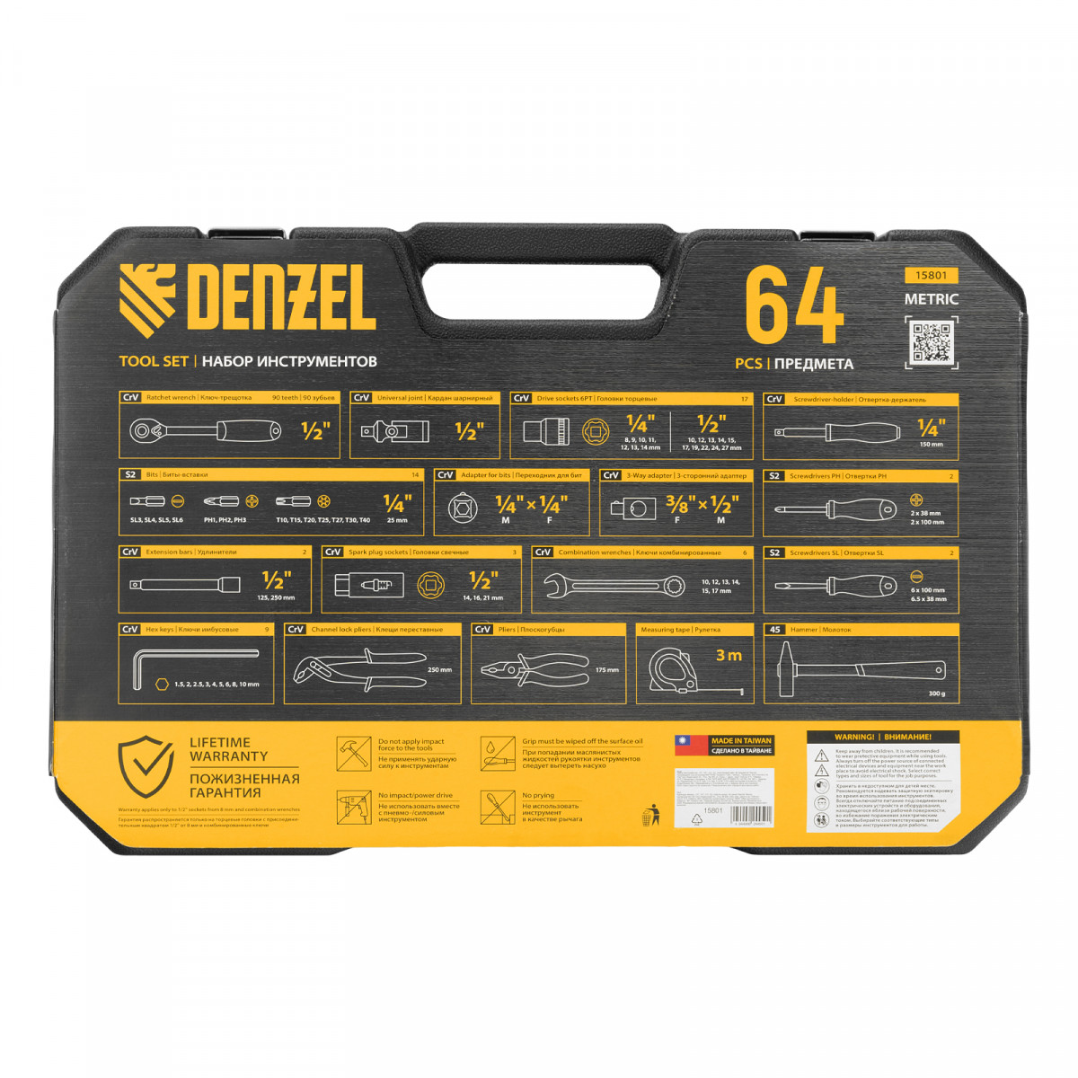 Набор инструментов, 1/2", 1/4", CrV, S2, пластиковый кейс, 64 предмета Denzel