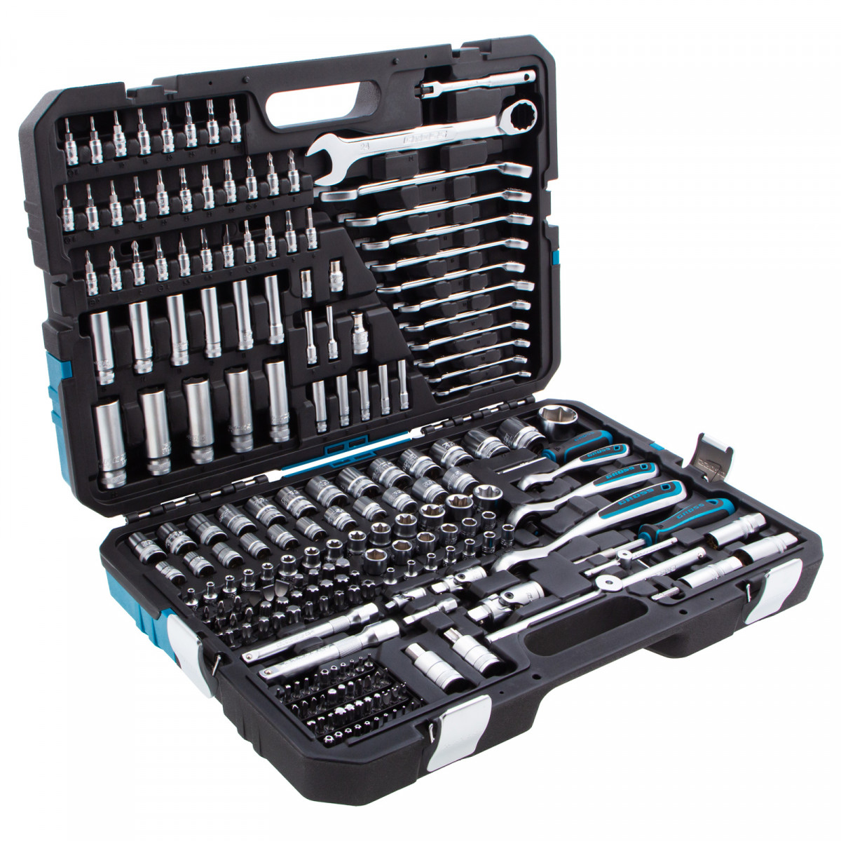 Набор инструментов Gross 14157 включает в себя 216 предметов, в том числе ключи-трещотки из стали CrV со 120 зубьями и присоединительным размером 1/4", 1/2" и 3/8". Входящие в комплект инструменты используются для монтажа и демонтажа резьбовых соединений. Воротки, удлинители и карданные шарниры облегчают работу в стесненных условиях. Набор пригодится водителям, сотрудникам автосервисов, а также домашним мастерам.