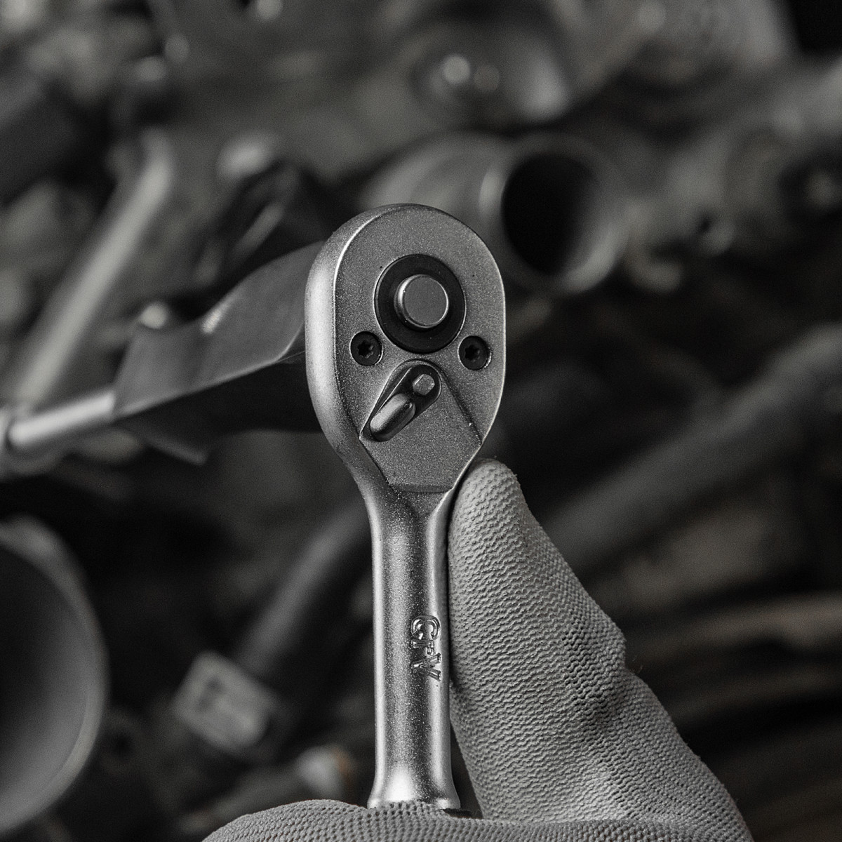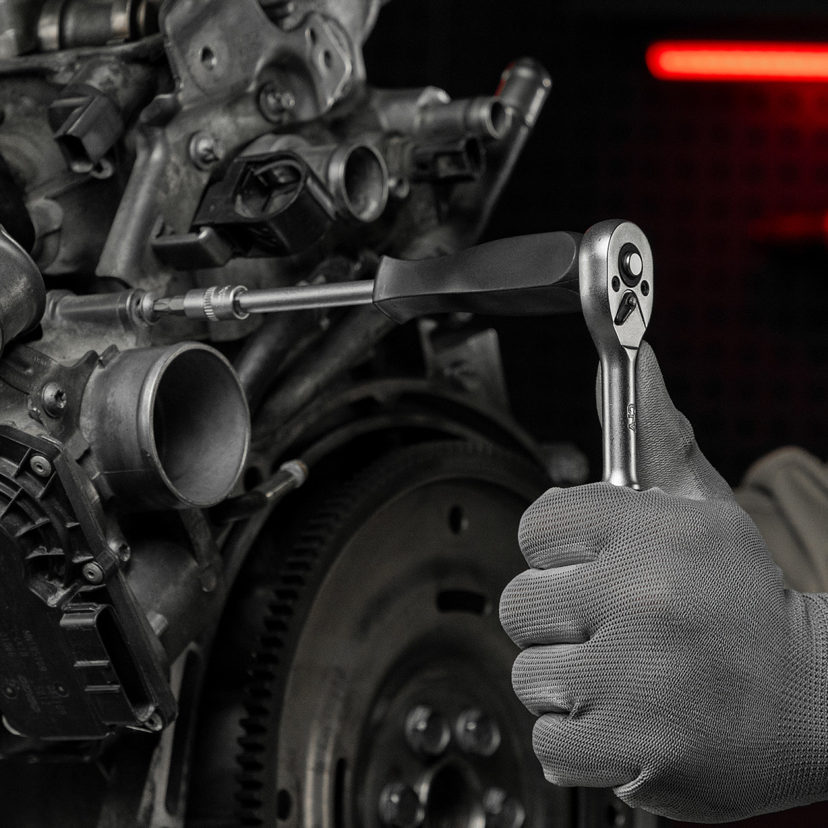 • Комфортная и эффективная работа — ключи-трещотки с 45 зубьями оснащены механизмом быстрого сброса, переключателем реверса с металлическим флажком и двухкомпонентной рукояткой.