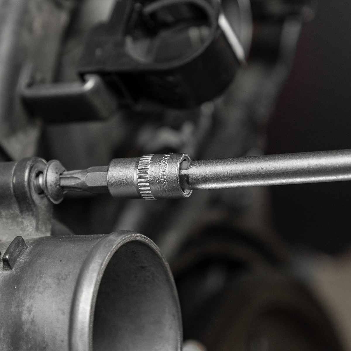 • Прочная фиксация — шариковый замок на трещотках, воротках, шарнирах и удлинителях надежно удерживает торцевые головки.