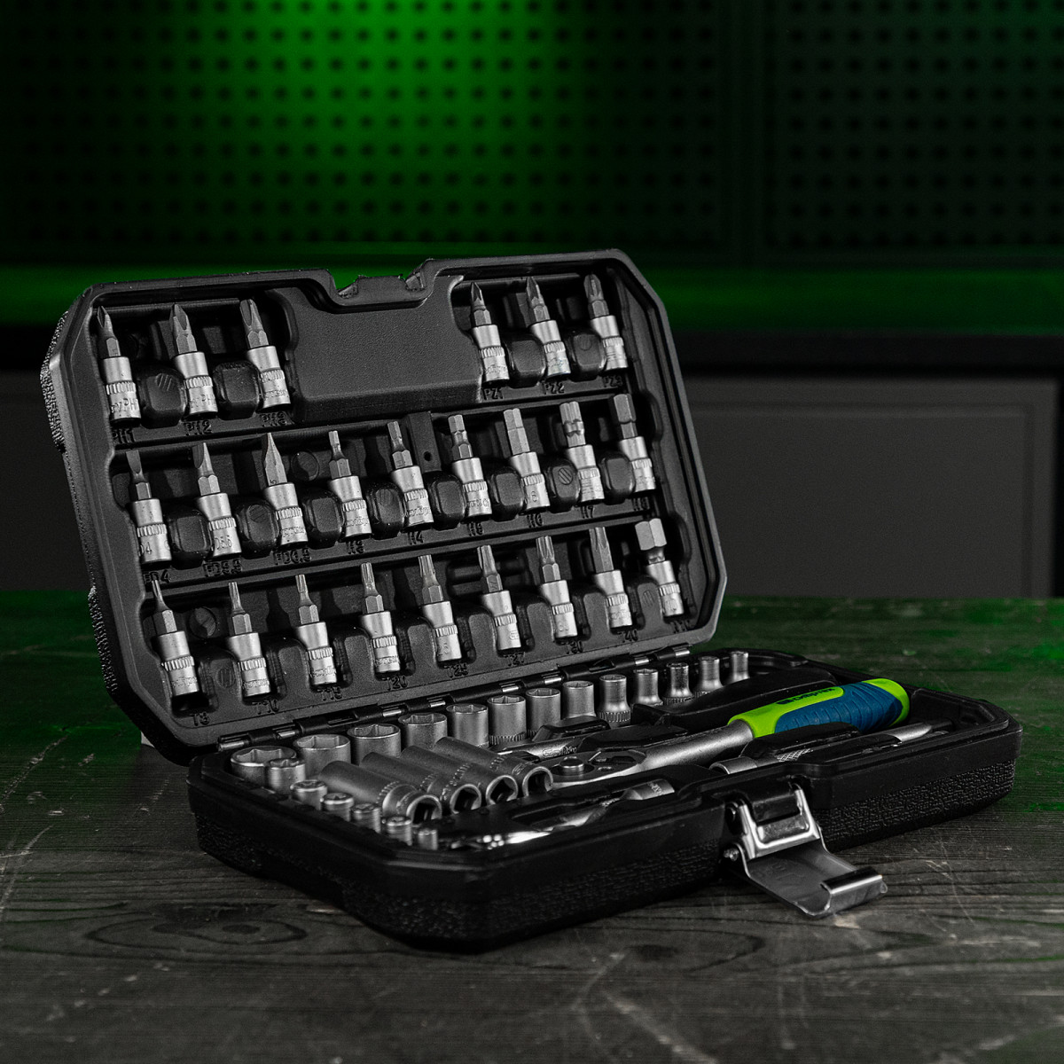 Набор инструментов Сибртех 13399, поставляющийся в пластиковом кейсе, состоит из 56 предметов с присоединительным размером 1/4", предназначенных для закручивания и откручивания резьбового крепежа. В комплект поставки входят 2 удлинителя и кардан, облегчающие работу в труднодоступных местах. Набор будет полезен для ремонта автомобиля в гараже, пригодится также и в быту.