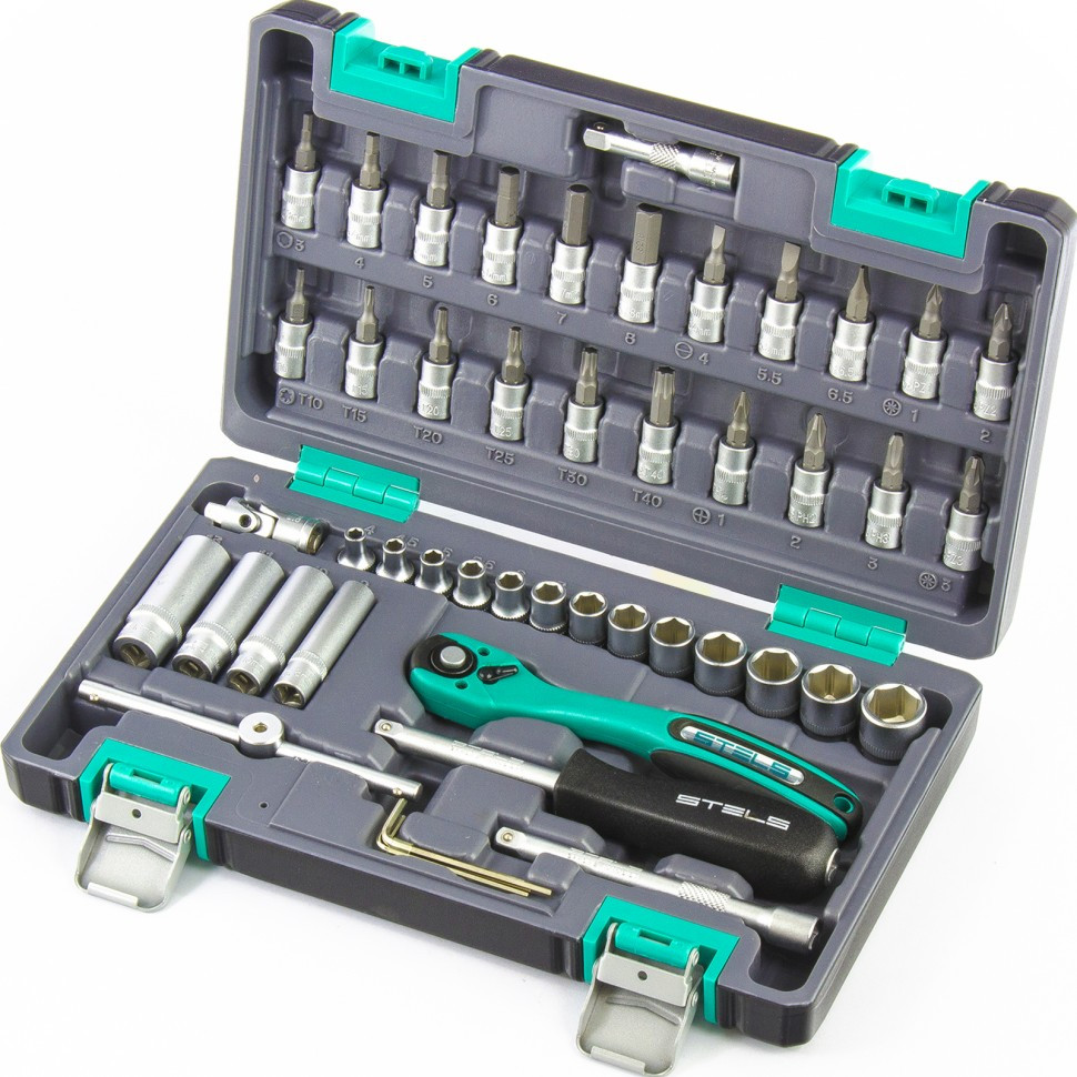Набор инструмента 1/4", CrV, S2, усиленный кейс, 47шт STELS 14099 подходит для автолюбителей и мастеров-профессионалов в области ремонта и обслуживания автомобилей и прочей техники. Все компоненты выполнены из прочных, износостойких материалов и упакованы в специальный кейс на металлических замках и с отдельными ячейками для каждого инструмента.