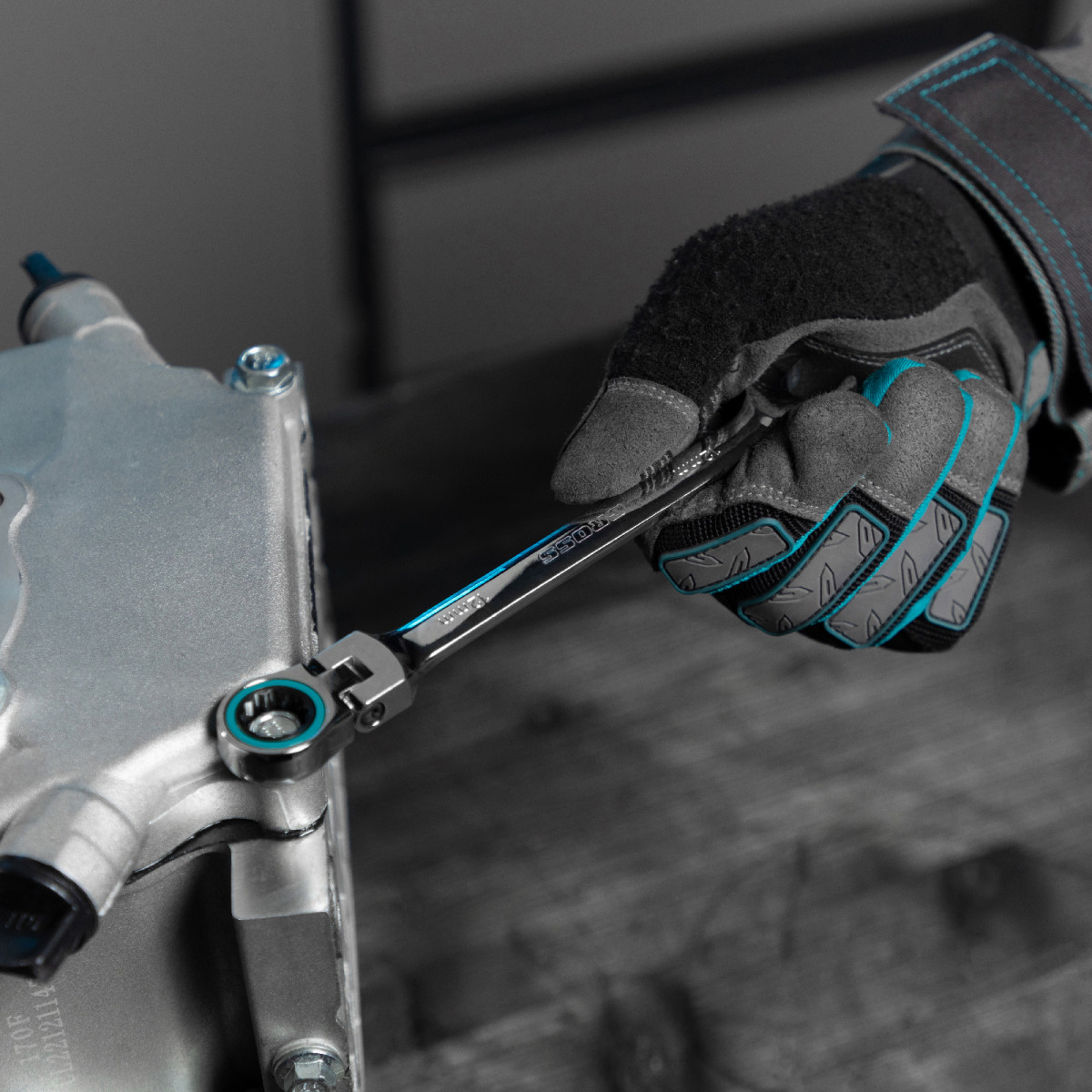 Набор шарнирных комбинированных ключей с трещоткой Gross 14891 включает в себя 7 предметов из стали CrV для откручивания и закручивания резьбовых соединений с диаметром головки 8-19 мм. Благодаря наличию рожкового зева ключи подходят для любых типов крепежей. 12-гранная кольцевая головка обеспечивает надежный контакт с поверхностью болта или гайки, облегчая работу и уменьшая риск деформации граней крепежа. Набор используется для обслуживания и ремонта автомобилей, пригодится также и в быту.