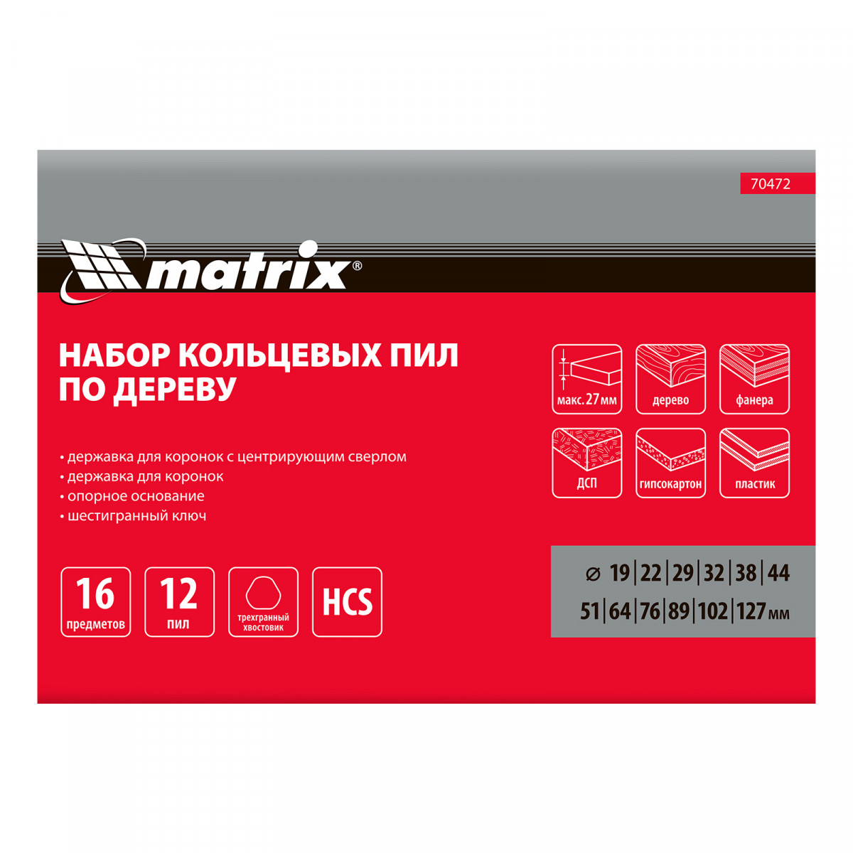 Набор кольцевых пил Matrix 70472 из 12 предметов предназначен для работы по дереву и включает коронки диаметром 19-127 мм. Они устанавливаются на электродрели и служат для выпиливания круглых отверстий в фанере, гипсокартоне, ДСП, ДВП и ламинате. Малая и большая державки облегчают установку пил разного диаметра. В комплекте имеется специальная проставка, исключающая проворот коронки во время сверления. Набор пригодится во время ремонта — с его помощью можно прорезать отверстия под розетки, выключатели, светильники и трубы.