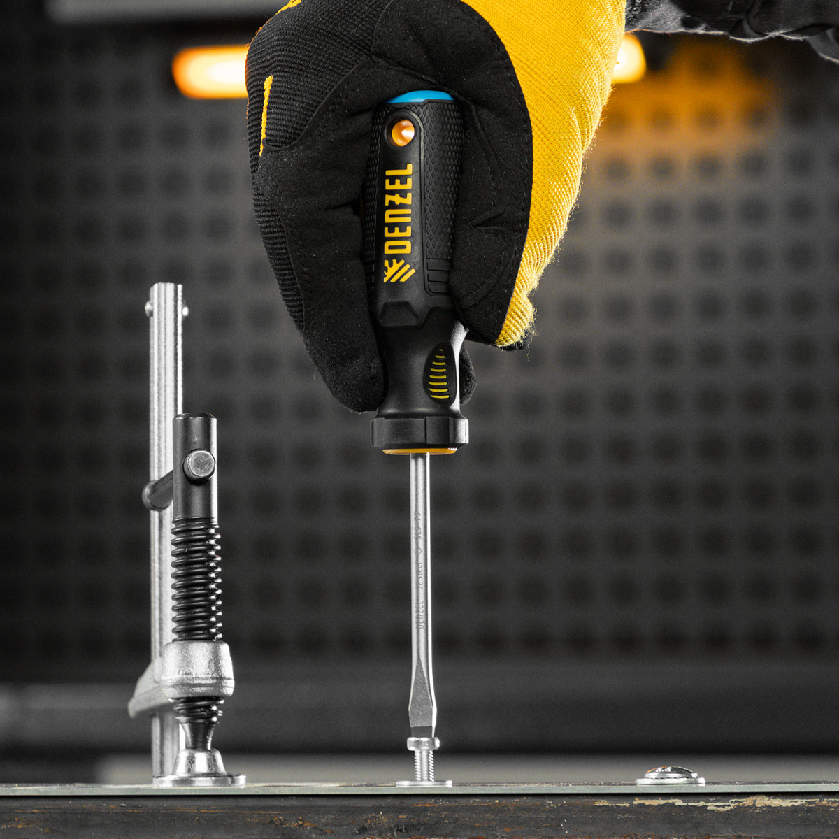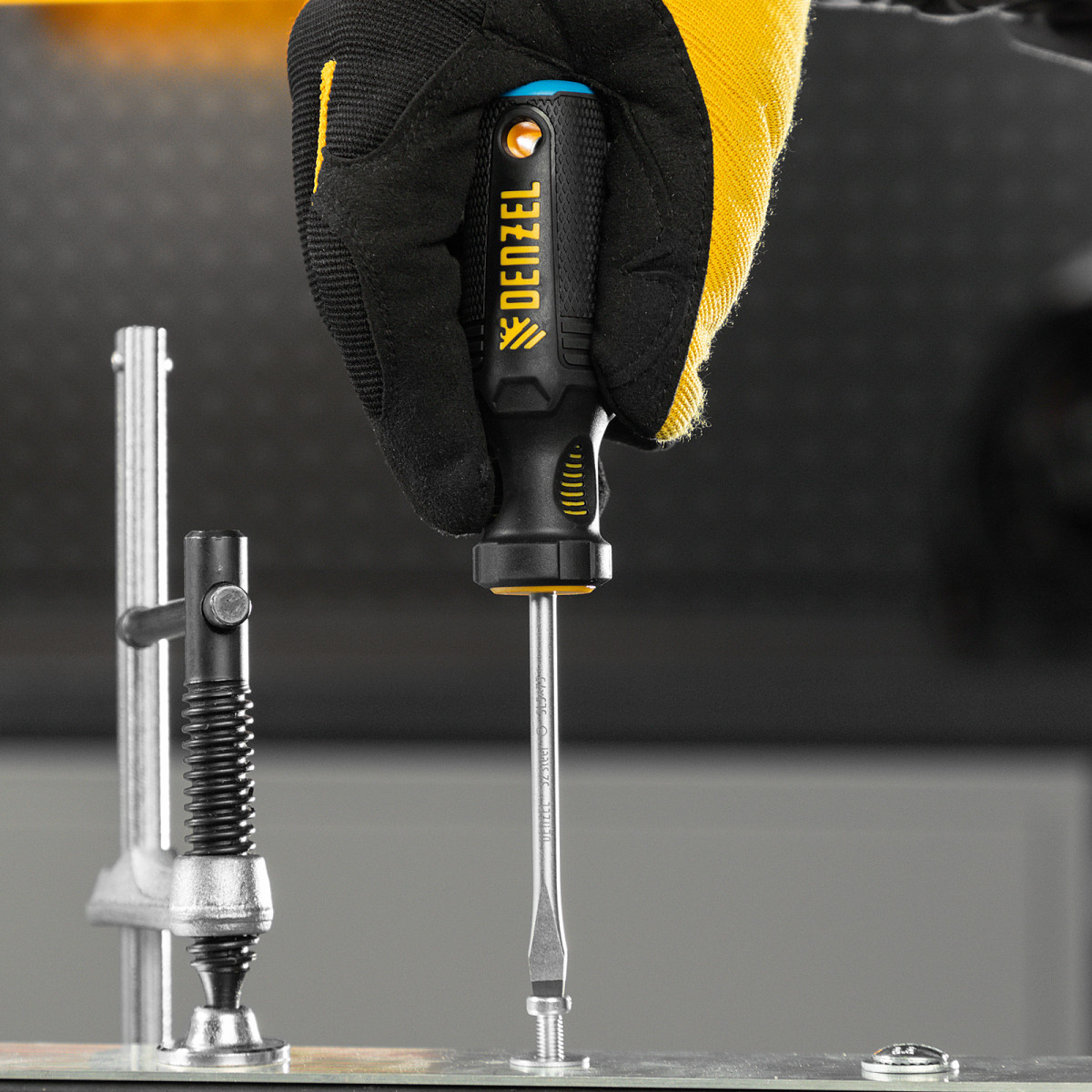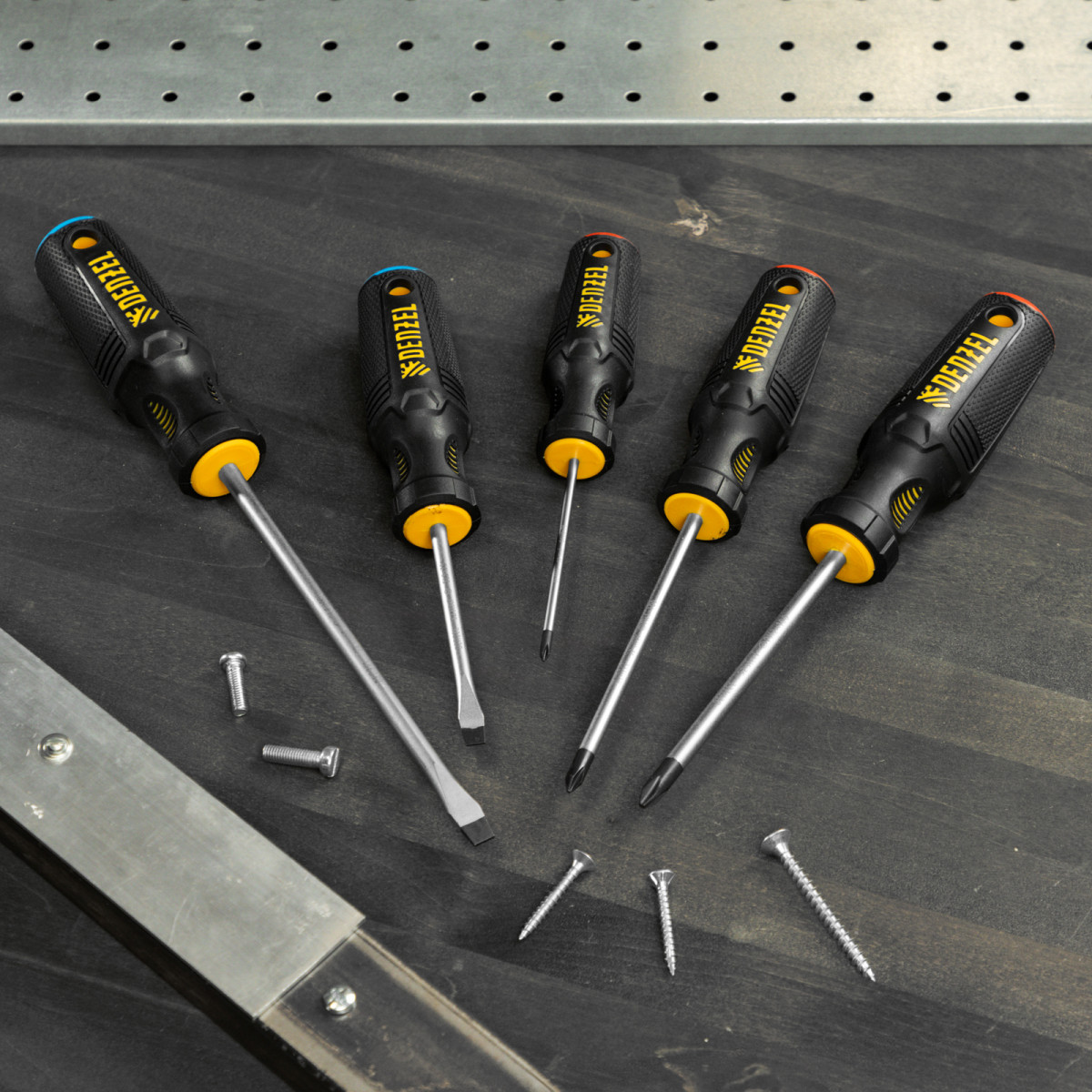 Набор Denzel 122157 из 5 отверток с трехкомпонентными рукоятками, изготовленных из стали S2, используется для монтажа и демонтажа резьбового крепежа со шлицами типа SL и PH. Высокоточные шлицы намагничены, поэтому во время работы не нужно придерживать винты или саморезы рукой. Набор подходит для интенсивного использования.