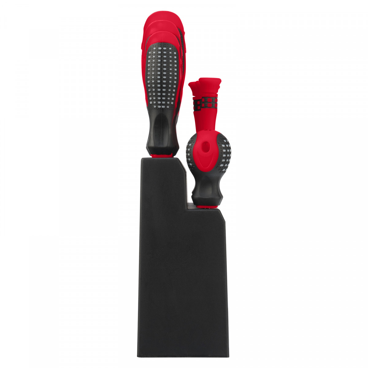 - Удобное хранение — отвертки размещаются на пластиковой подставке, которую можно поставить на стол или повесить на стену.