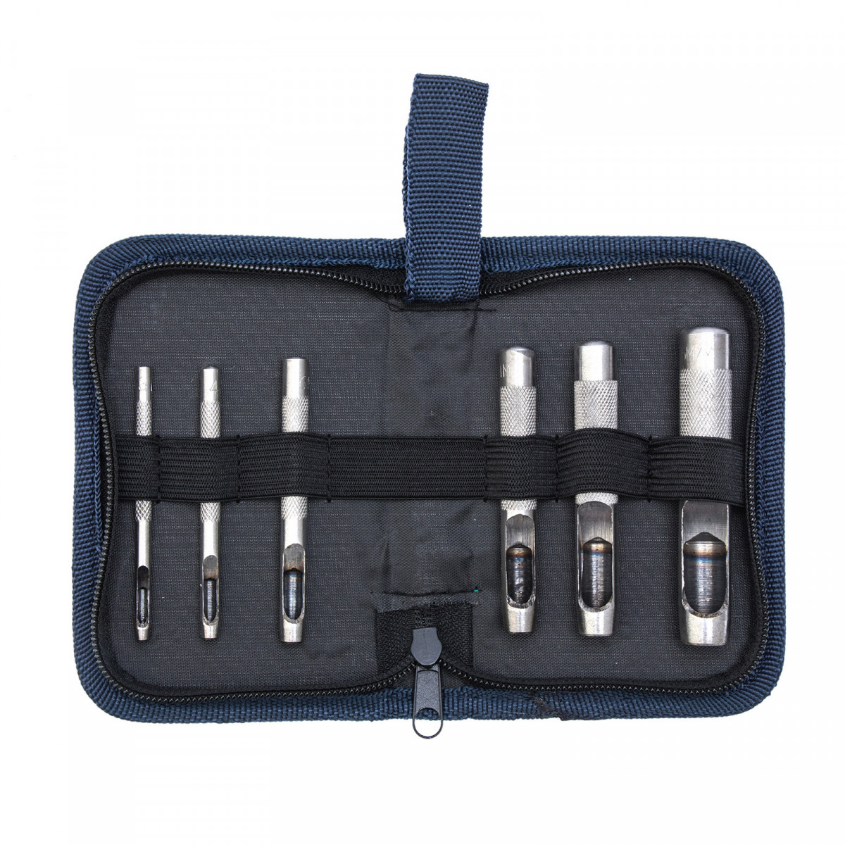 Набор пробойников для кожи Сибртех 18306, 6 шт. в чехле, позволяет пробить отверстия диаметром 3, 4, 6, 8, 10 и 12,5 мм посредством ударного воздействия от киянки. Инструменты предназначены для работы с плотными материалами: кожей и резиной. Благодаря высокоточной прецизионной заточке режущих кромок пробойники выполняют ровный и качественный рез.