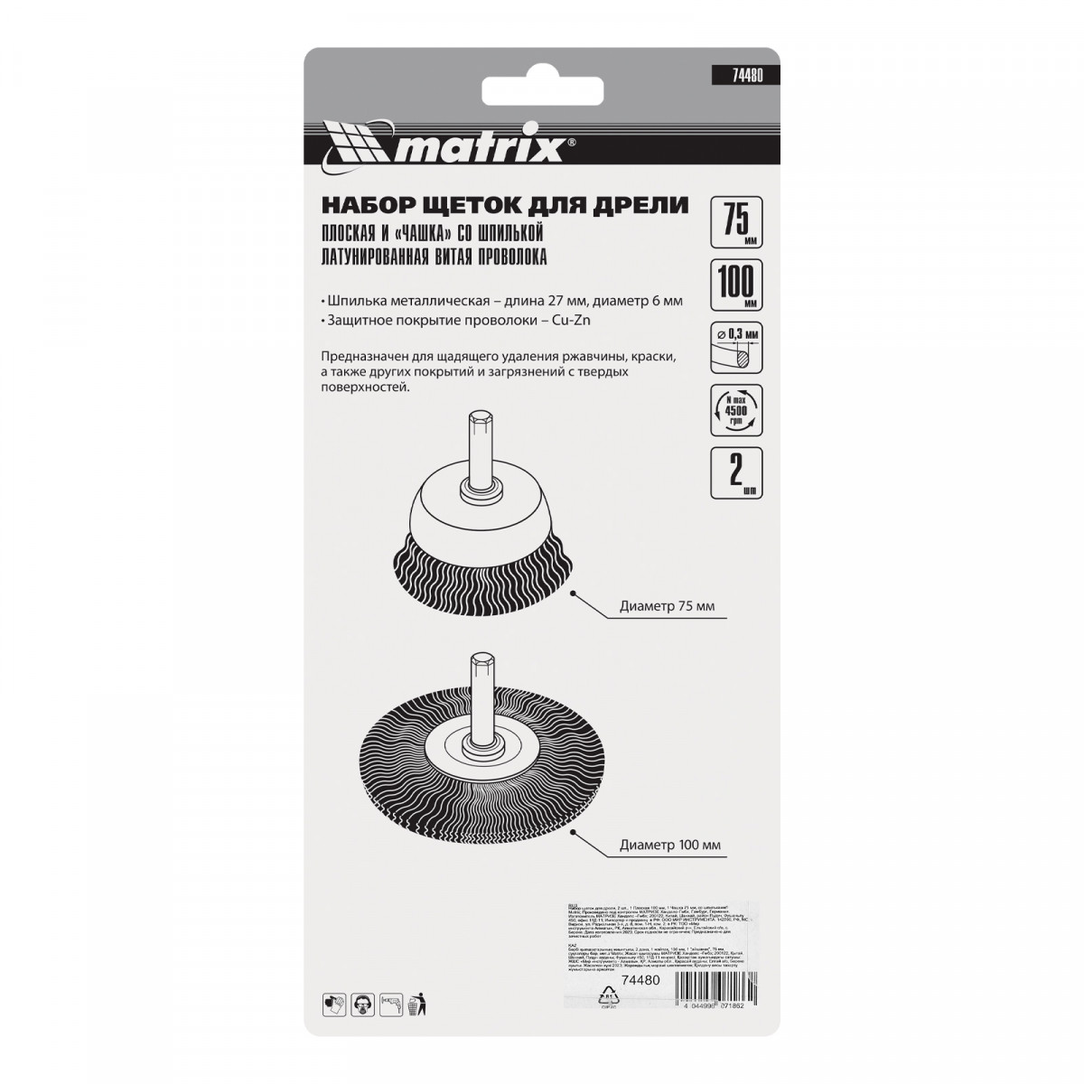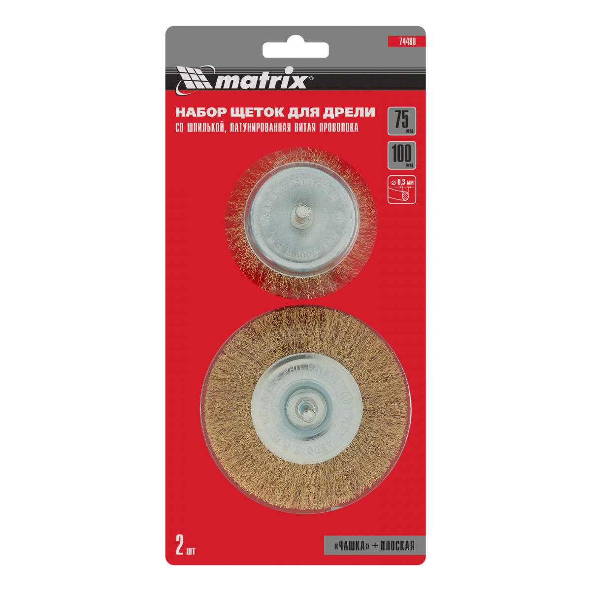 Набор щеток для дрели, 2 шт, 1 плоская, 100 мм, 1 "чашка", 75 мм, со шпильками Matrix