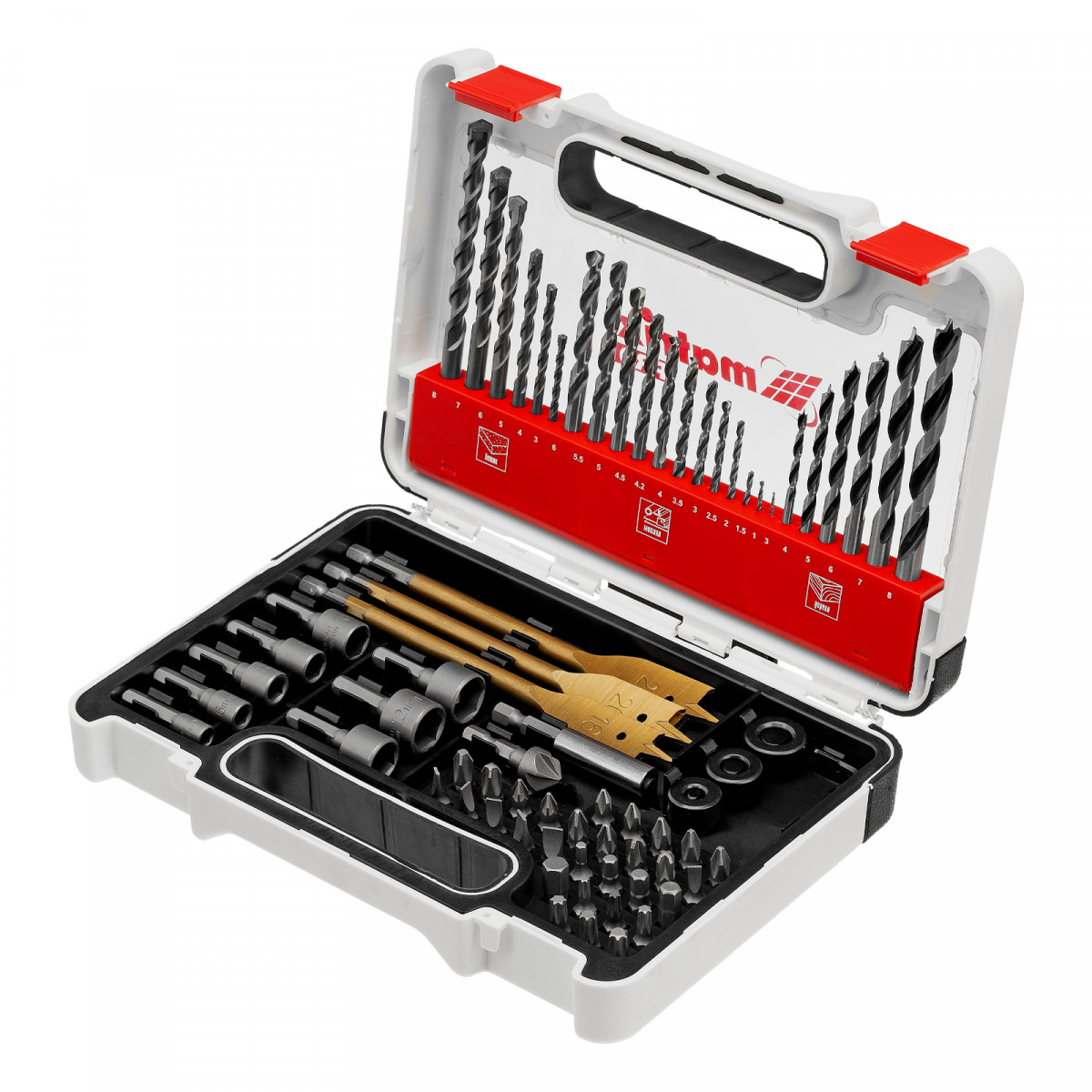 Комбинированный набор Matrix PRO 725671 — универсальное решение для мастеров, т. к. он содержит 71 предмет: отверточные биты (30 шт.) и адаптер к ним, шестигранный ключ, зенковку, стопорные кольца, 8 торцевых головок, 3 перовых сверла, сверла по дереву 3-8 мм, сверла по бетону 3-8 мм и сверла по металлу 1-6 мм. Оснастка подходит как для бытового использования, так и решения профессиональных задач.