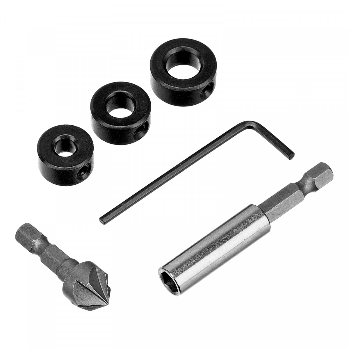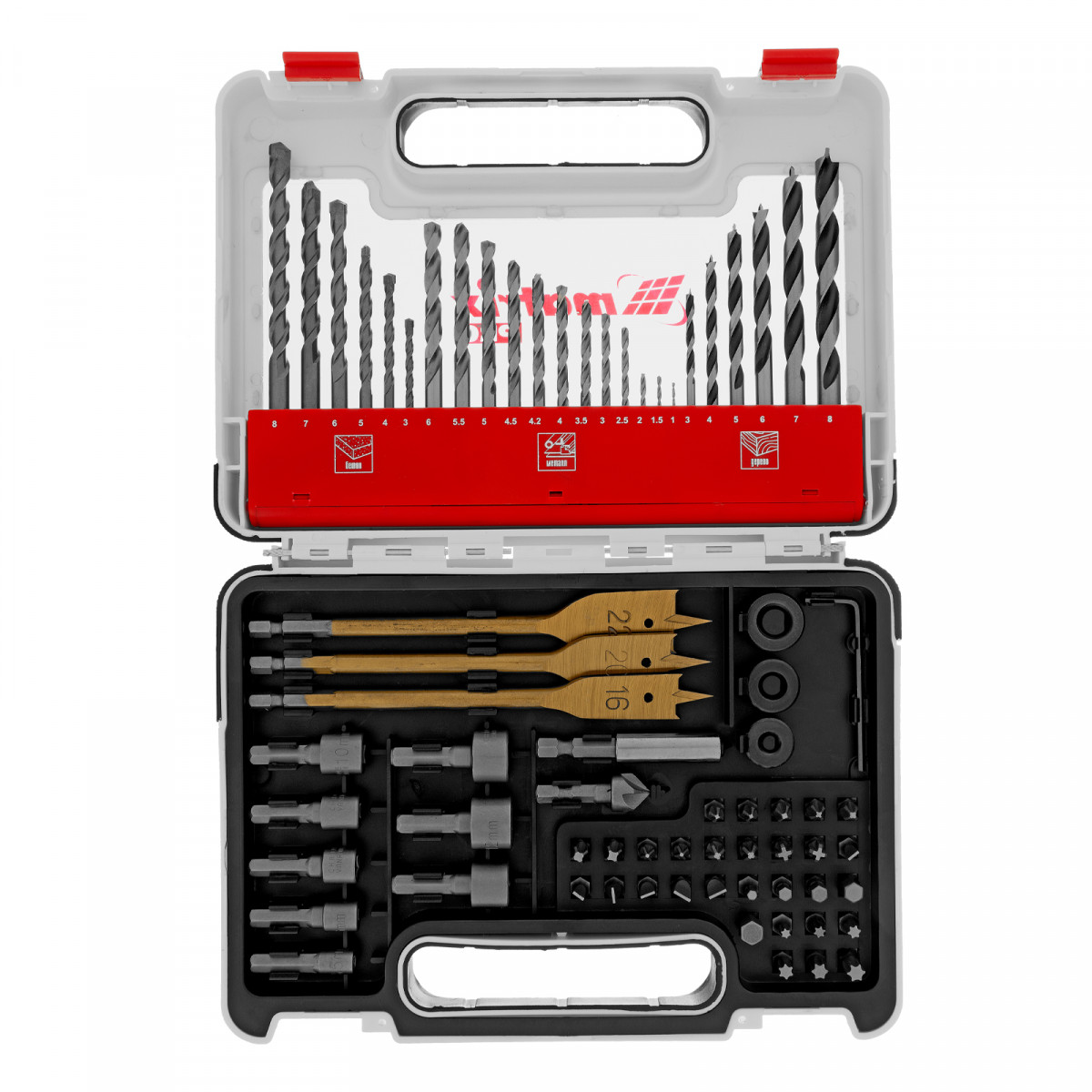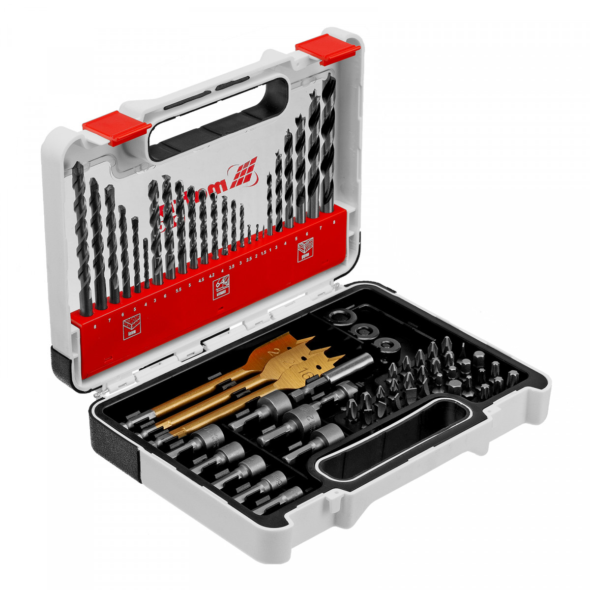 Сверло по металлу 1, 1,5, 2, 2,5, 3, 3,5, 4, 4,2, 4,5, 5, 5,5, 6 - 12 штСверло по бетону 3, 4, 5, 6, 7, 8 - 6 штСверло по дереву 3, 4, 5, 6, 7, 8 - 6 штБита 25 мм PH1, PH2, PH3, PZ1, PZ2, PZ3, SL4, SL5, SL6, TORX15, TORX20, TORX25, TORX27, TORX30, TORX35, HEX3, HEX4, HEX5, HEX6, HEX7 - 30 штГоловка торцевая 5, 6, 7, 8, 10, 11, 12, 13 - 8 штСверло перовое по дереву 16, 20,22 - 3 штСтопорное кольцо 6, 8, 10 - 3 штЗенковка по дереву - 1 штАдаптер для бит с магнитом - 1 штКлюч шестигранный - 1 штПластиковый кейс - 1 шт