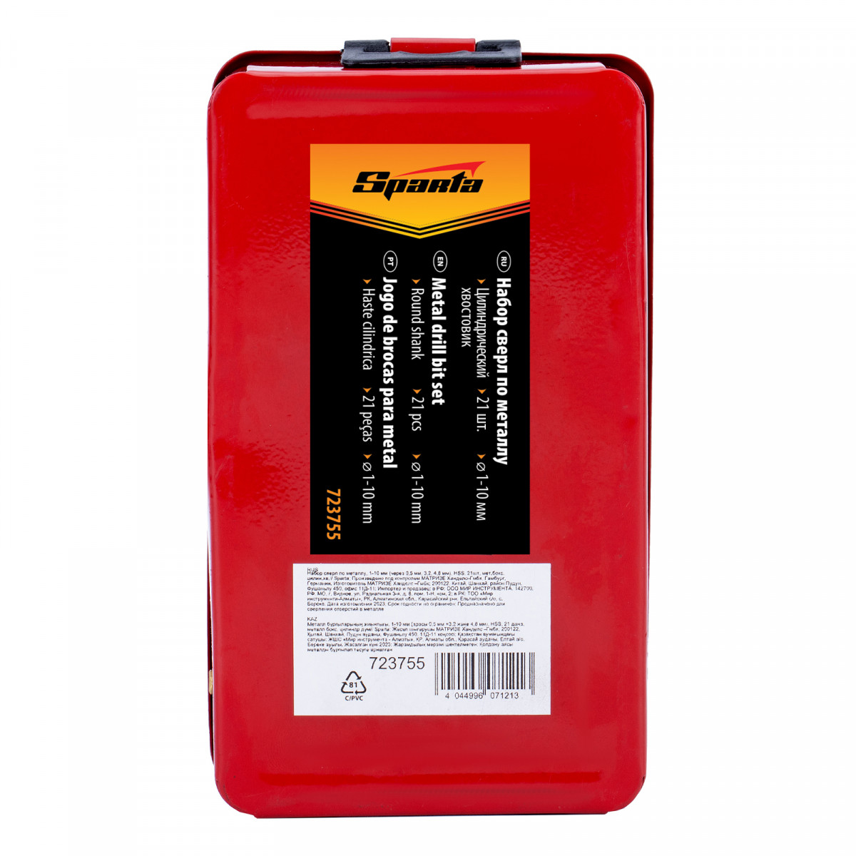 Набор сверл по металлу, 1-10 мм, (через 0.5 мм +3.2 и 4.8 мм) HSS 21 шт, металлический бокс, цилиндрический хвостовик Sparta