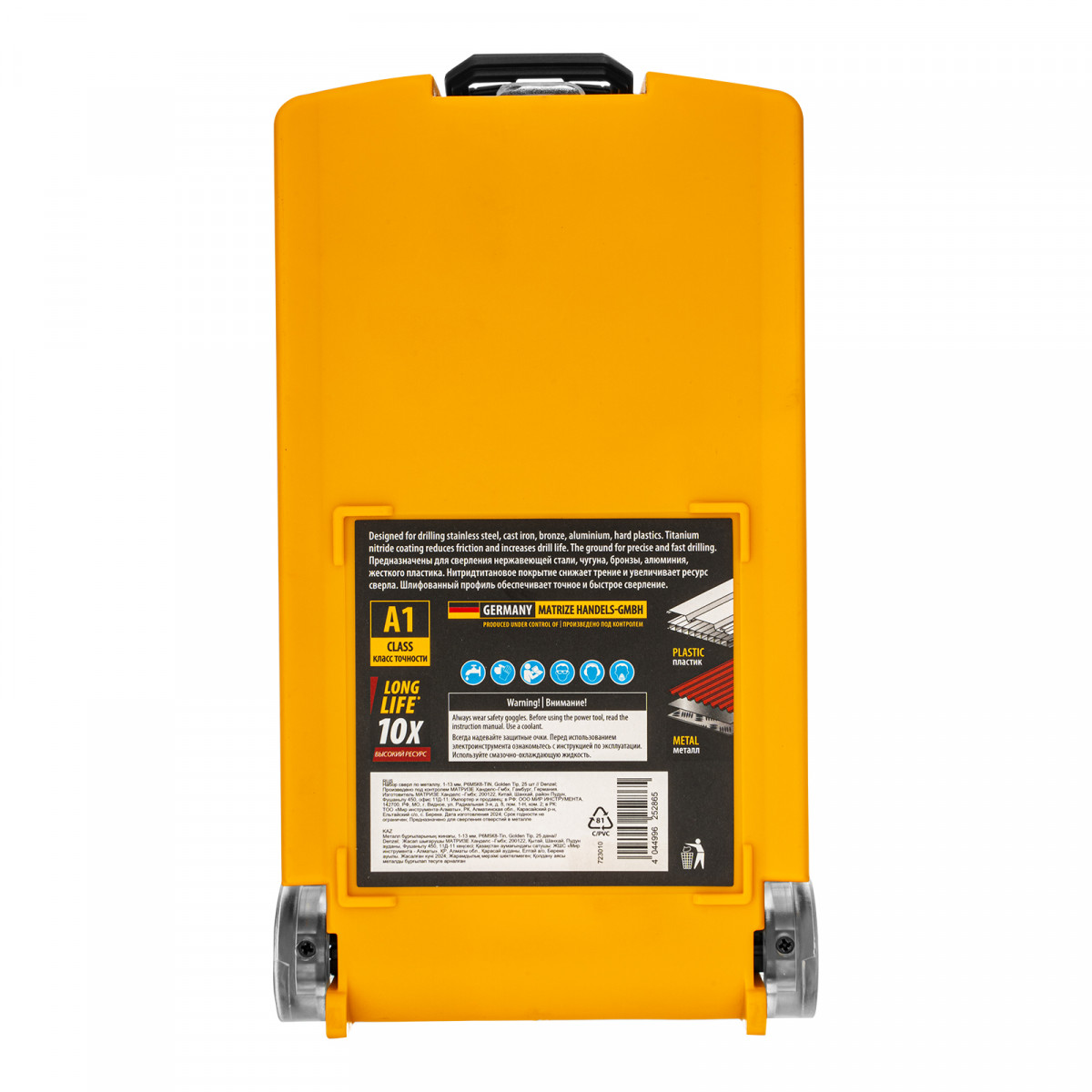 Набор Denzel Golden Tip 723010 состоит из 25 сверл по металлу диаметром 1-13 мм, изготовленных из стали P6M5K8. Угол заточки составляет 135°, что позволяет получать чистые и ровные отверстия в закаленной и нержавеющей стали, цветных и черных металлах, а также жестком пластике. Сверлам присвоен класс точности A1, что гарантирует высокое качество выполняемых работ. Оснастка характеризуется пониженным коэффициентом трения, что облегчает сверление и улучшает отвод стружки. Набор будет полезен дома и в мастерской.