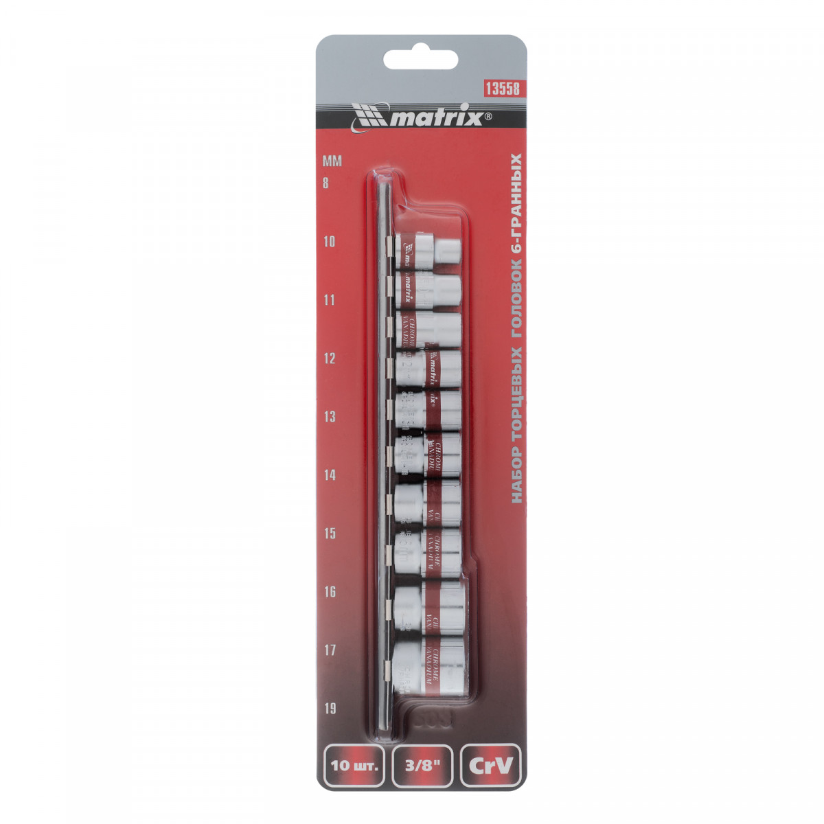 Набор торцевых головок 3/8", 6 гранные, CrV, 8-19мм, 10 штук Matrix