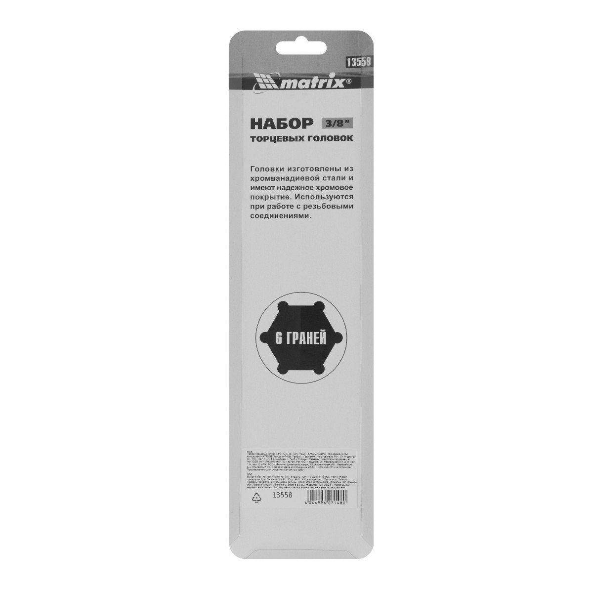 Набор торцевых головок Matrix 13558 из стали CrV, с посадочным гнездом 3/8" и шестигранным профилем, включает 10 насадок диаметром 8-19 мм, предназначенных для работы с резьбовыми соединениями. Пригодится для проведения бытового ремонта, будет полезен сантехнику, слесарю, авторемонтнику.