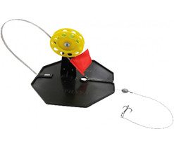 Набор жерлиц на подставке производства ГК ТОНАР, оснащенная леской диаметром 0,35м м, длиной 15м., грузом оливка 10гр, вольфрамовым поводком длиной 20см с вертлюжком типа бочонок с одной стороны и карабином с застёжной с другой. За карабин пристёгнут тройник №6. Набор состоит из 10 шт.