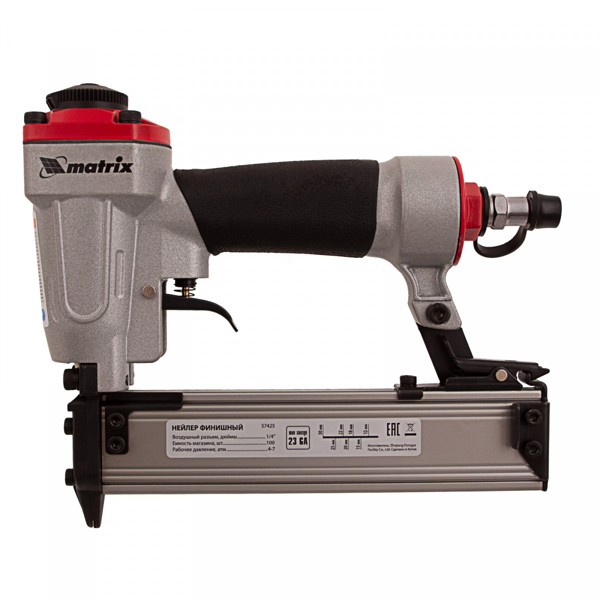 Пневматический финишный нейлер Matrix 57425 (шпилькозабивной пистолет) предназначен для забивания гвоздей 23GA диаметром 0,64 мм и длиной 10-30 мм. Он используется для финишной отделки, а также сборки мебели и производства упаковки. Благодаря низкому расходу воздуха 0,7 л/мин нейлер совместим с любым типом компрессоров.