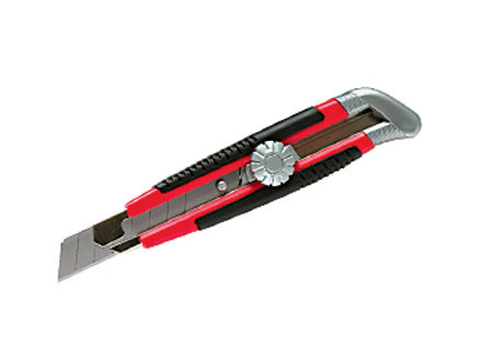 Пластмассовый обрезиненный корпус с металлической направляющей. Нож имеет автоматическую и винтовую фиксацию лезвия. Замена лезвия осуществляется вручную через хвостовую часть ножа. Предназначен для разрезания бумаги, картона и прочих материалов.