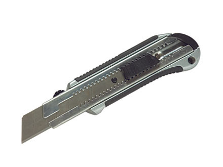 Металлический эргономичный обрезиненный корпус с усиленной направляющей. Нож имеет автоматическую фиксацию лезвия. Замена лезвия осуществляется вручную через хвостовую часть ножа. Предназначен для разрезания бумаги, картона и прочих материалов с применением значительных усилий.