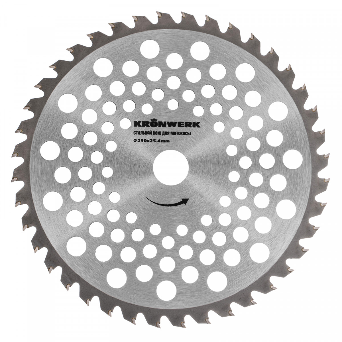Нож для триммера Kronwerk 96343 размером 230 х 25,4 мм, толщиной 1,3 мм, с 40 зубьями, предназначен для скашивания травы всех типов, в том числе травы с толстыми жесткими древовидными стеблями (полыни, крапивы, лебеды, борщевика), а также кустарника и молодых побегов деревьев с диаметром стволов до 10 мм.