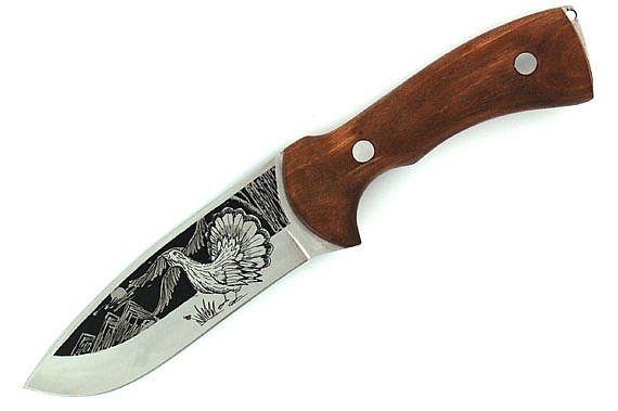 Нож является одним из самых важных инструментов как в походе, так и на охоте или рыбалке. С его помощью возможно не только моментально вскрыть консервную банку, но и разрезать веревку или прорубить тропинку в зарослях. Помимо этого, ножи могут быть использованы в ряде других сфер, например спорт или кулинария. Также не каждый нож требует наличия лицензии. Туристические ножи, например, не относятся к холодному оружию, из-за чего их может приобрести любой желающий. Производственное предприятие ООО ПП «Кизляр» занимается выпуском высококачественных ножей начиная с конца 90х годов. Огромный ассортимент компании, который создается по современным стандартам мастерами своего дела, порадует своим разнообразием. Весь товар этого производителя проходит полевые испытания перед тем как оказаться на складах и полках магазинов. Представленная модель туристического угловатого ножа под названием "Глухарь" отлично справится со всеми своими задачами, которые могут пасть на неё во время обычного использования. Лезвие с особым оформлением в виде гравировки изготовлено из стали AUS-8. Рукоятка сделана из дерева ореха. Общая длина равна 260 мм. Длина клинка равна 130 мм, толщина 2,4 мм. Твердость находится на уровне 57-59 HRC. ОБРАЩАЕМ ВАШЕ ВНИМАНИЕ: Данная модель не является холодным оружием.