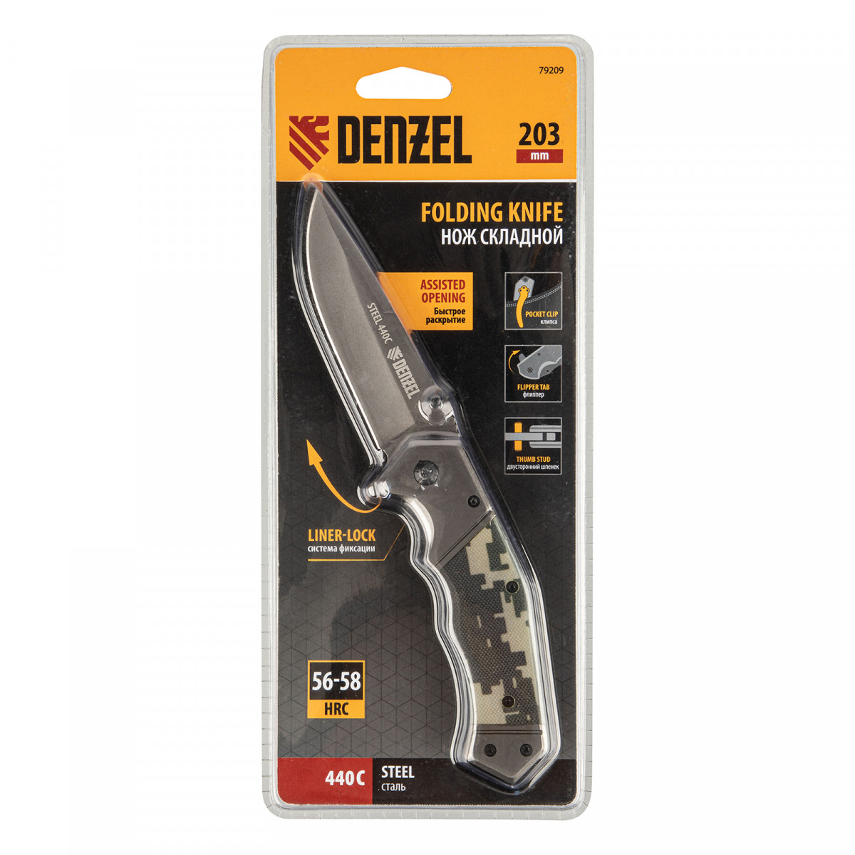 Многоцелевой складной нож Denzel 79207 длиной 205 мм, с системой Liner-Lock, накладкой G10 на эргономичной рукоятке, находит широкое применение при активном отдыхе на природе, во время рыбалки и охоты. Флиппер помогает быстро раскрывать нож.