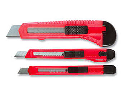 Ножи с пластмассовым корпусом, кнопки выдвижения и фиксации лезвий. Замена лезвия осуществляется вручную через хвостовую часть ножа.