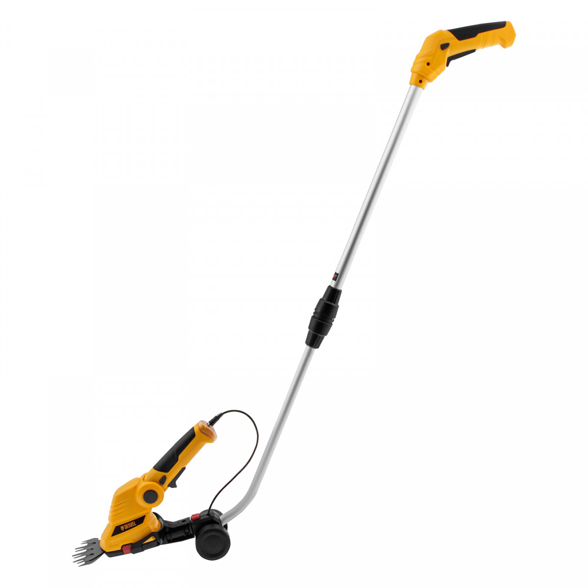 Аккумуляторные ножницы-кусторез Denzel G801E 968157 с телескопической штангой, с Li-Ion батареей емкостью 1,5 Ач и напряжением 7,2 В, используются для ухода за садовым участком. Поставляются с двумя насадками: для подрезания газонной травы и для обрезки кустов и тонких веток деревьев. Небольшой вес 1,1 кг и съемная штанга с колесным блоком обеспечивают комфортное использование ножниц-кустореза.