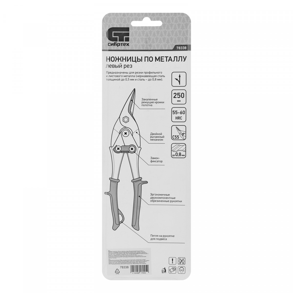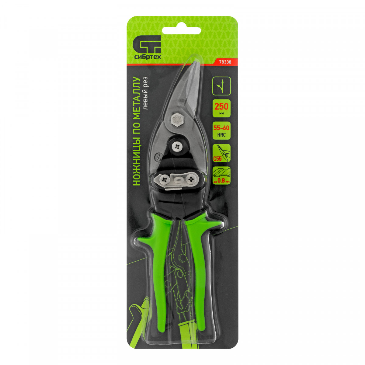 Ножницы Сибртех 78338 длиной 250 мм, из стали С55, с двухкомпонентными рукоятками, используются для левого реза профильного и листового металла. Предназначены для проведения ремонтных и монтажных работ с материалами толщиной до 0,8 мм.