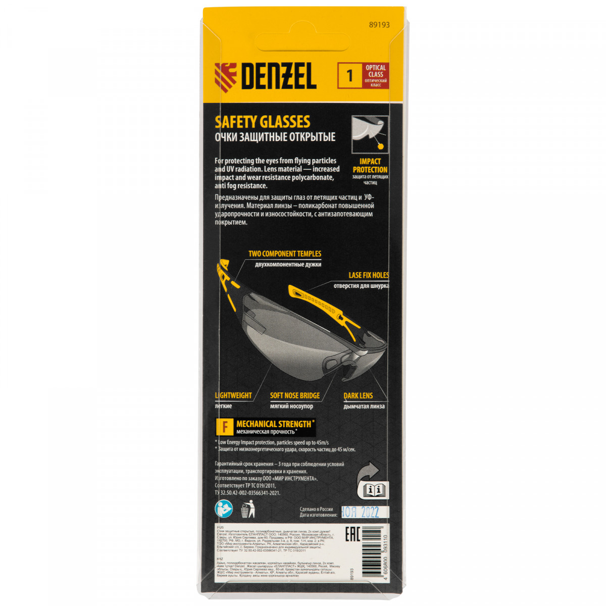 Очки защитные открытые, поликарбонатные, дымчатая линза, 2х комп.дужки Denzel