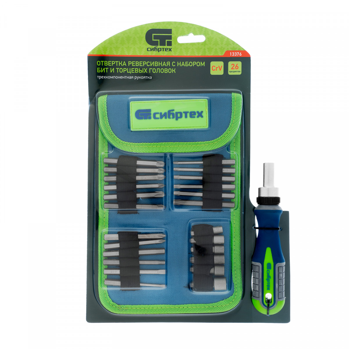 Реверсивная отвертка с набором бит и торцевых головок Сибртех 13376, 25 предметов из стали CrV в чехле, — это надежный инструмент для решения бытовых задач. С помощью сменных бит можно производить монтаж/демонтаж резьбовых соединений со шлицами SL, PH, PZ, TORX, HEX. А благодаря их удлиненной конструкции обеспечивается доступ к труднодоступным местам. Торцевые головки позволяют работать с болтами, гайками и другим крепежом.