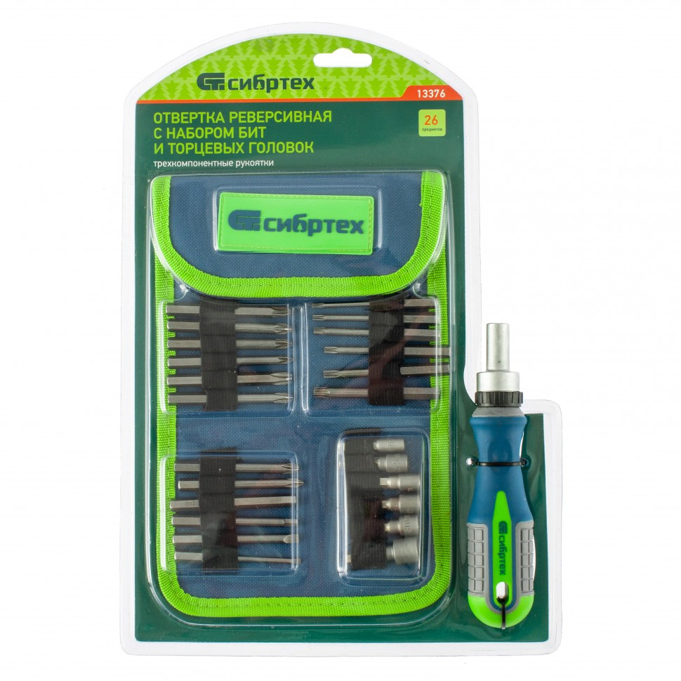 Реверсивная отвертка с набором бит и торцевых головок, 26шт, CrV, чехол СИБРТЕХ 13376 - используется для ремонта, сборки и демонтажа различных приборов, небольших конструкций и пр. Станет надежным помощником в быту. Заменит целый арсенал отверток и не займет много места при хранении. Рабочие концы бит намагничены. Насадки выполнены из хром-ванадиевой стали высокого качества, имеют защитное покрытие. Твердость рабочих частей составляет 50-52 HRC.