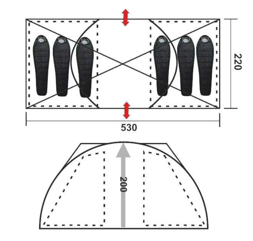 Прочный каркас палатки выполнен из фибергласа диаметром 11 мм и стальных стоек. Палатка имеет двухслойную конструкцию с 2 входами, которые можно использовать в качестве навесов, и 4 вентиляционными окнами. Высокий тамбур позволяет стоять во весь рост.