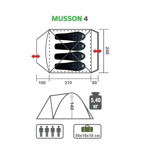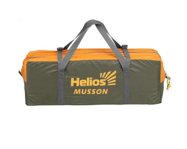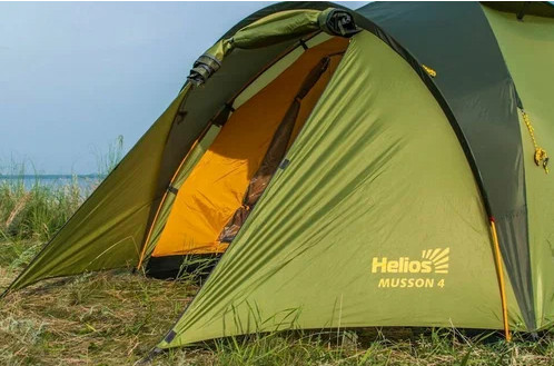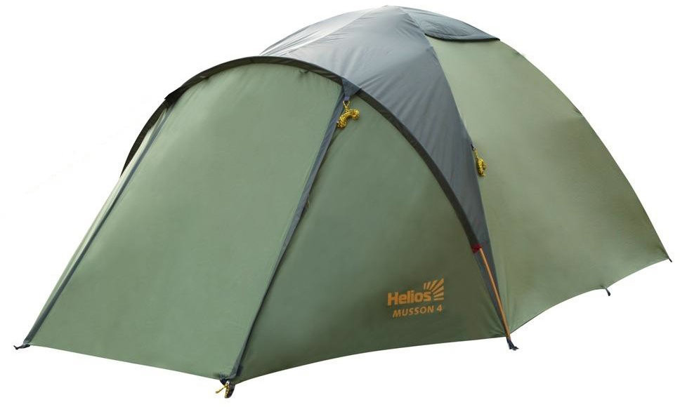 Helios Палатка MUSSON 4 (Helios) - удобная 4-местная палатка с вместительным тамбуром, сформированным отдельной дугой. В тамбуре поместится большое количество снаряжения. Тент палатки имеет 2-слойную структуру и оснащен 2 широкими входами. Вентиляционные клапаны с 2 сторон обеспечат комфортный микроклимат в палатке. Антмоскитная сетка. Все швы проклеены. Материал тента: полиэстер. Материал каркаса: стеклопластик. Диаметр дуг: 7.9мм.