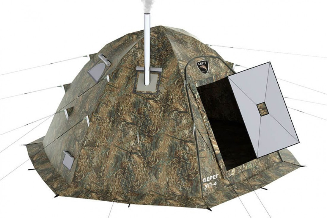 Универсальная палатка УП-4 "Берег" - однослойная восьмиместная быстросборная палатка шатрового типа на восьмилучевом алюминиевом каркасе для отдыха на природе, охоты, зимней рыбалки и туризма.