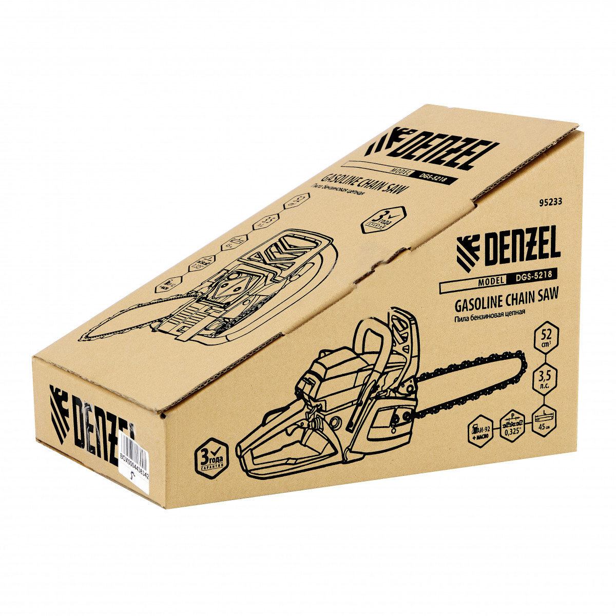 Пила цепная бензиновая Denzel DGS-5218 95233 с двигателем объемом 52 см3 и мощностью 3,5 л.с. поставляется с шиной длиной 45 см и цепью с 72 звеньями (шаг 0,325″, паз 1,5 мм). Инструмент предназначен для заготовки дров, обрезки ветвей и сучьев в саду, распила древесины твердых и мягких пород. Пила выдерживает интенсивные нагрузки, используется во время строительных и ремонтных работ, будет полезна на дачном участке.