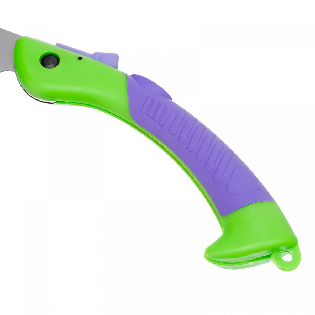 - Безопасное хранение и транспортировка — кнопочный фиксатор надежно удерживает лезвие в сложенном состоянии.