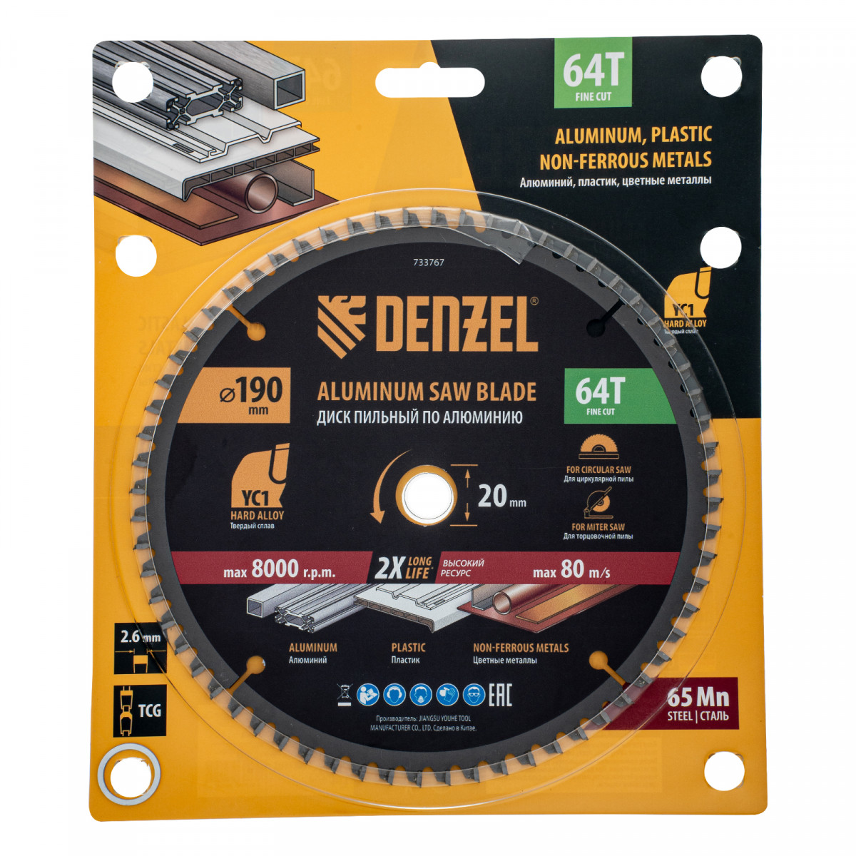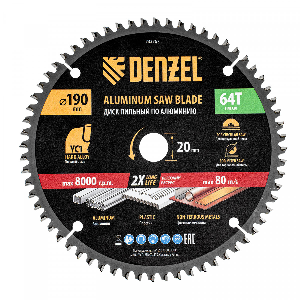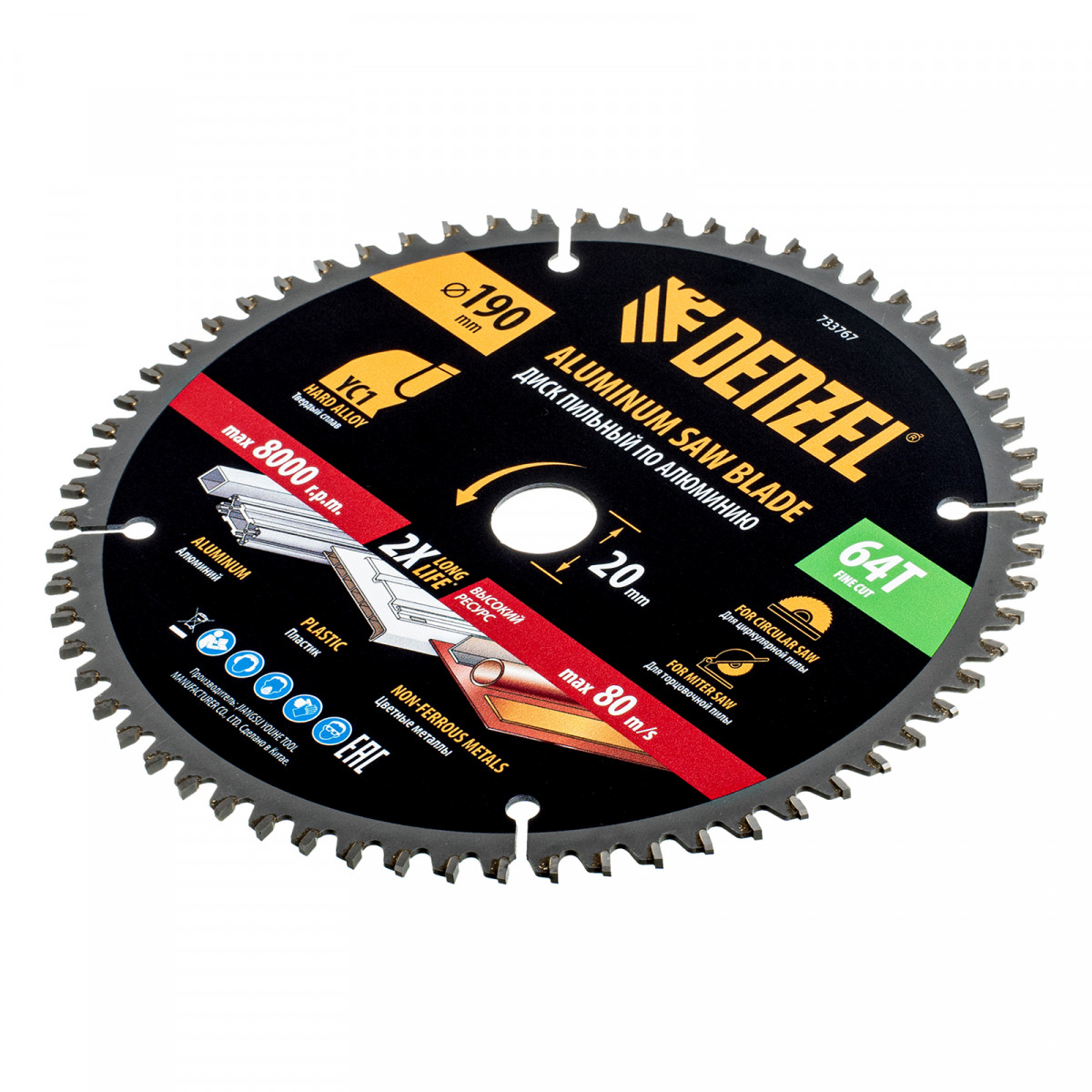Пильный диск по алюминию ф190 х 20 мм, 64 зубьев Denzel