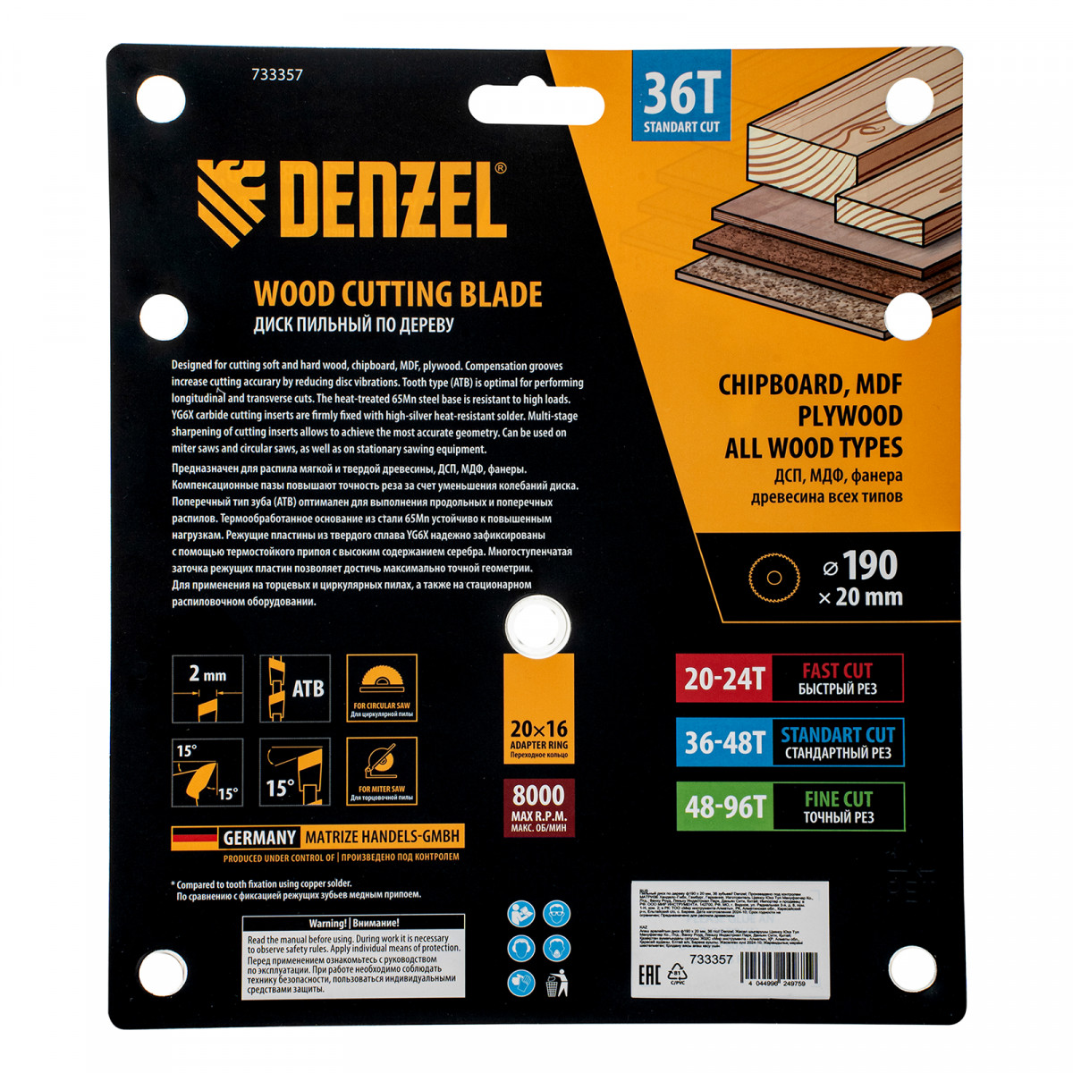 Пильный диск Denzel 733357 диаметром 190 x 20 мм, с 36 зубьями, предназначен для продольного и поперечного распила твердой и мягкой древесины, фанеры, МДФ, ДСП. 36 зубьев типа ATB с режущими пластинами оптимальной геометрии обеспечивают качественный рез. Тип реза — стандартный. Режущие пластины из твердого сплава YG6X сохраняют рабочие свойства при интенсивном использовании. Диск устанавливается на циркулярную, торцовочную пилу или на распиловочный станок. В комплект поставки входит переходное кольцо с 20 на 16 мм, что позволяет изменить посадочный размер и расширяет возможности использования диска.