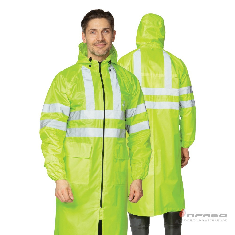 Плащ влагозащитный прямого силуэта, с рукавами реглан, с притачным капюшоном, с центральной застёжкой на молнию, с внутренней ветрозащитной планкой под молнию. Полочка с двумя нижними накладными карманами, с вентиляционными отверстиями в области подмышечных впадин, закреплёнными металлическими блочками. Спинка с кокеткой, по нижнему краю кокетки 2 вентиляционных отверстия со средним швом, переходящим в открытую шлицу, с вентиляционными отверстиями, в области подмышечных впадин, закрепленными металлическими блочками. Рукава реглан, одношовные, с внутренними манжетами на юбке, низ манжета на эластичной тесьме. Все швы проклеены специальной лентой, обеспечивающей герметичность изделия. На изделия нанесены светоотражающие полосы: по 2 полосы на рукавах, по 1 полосе на плечах и по 1 полосе на п