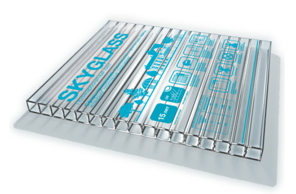 Сотовый поликарбонат SKYGLASS — представляет марку, отличающуюся оптимальным соотношением цены и качества, с защитой от UV-излучения 30 мкм. Кроме того, стоит отметить дополнительные преимущества сотового поликарбоната SKYGLASS, которые гарантируют длительный срок службы в любых сферах его применения: отлично пропускает световые лучи и рассеивает их; обладает шумо- и теплоизоляцией; пластичен; обладает повышенной ударопрочностью; долговечен; легкий – в 16 раз легче стекла, однако обладает такими же светопропускными свойствами; при повреждении не образует осколков; вязкая структура позволяет легко изгибаться даже в холодном состоянии; легко монтируется с помощью специальных профилей из поликарбоната или алюминия.