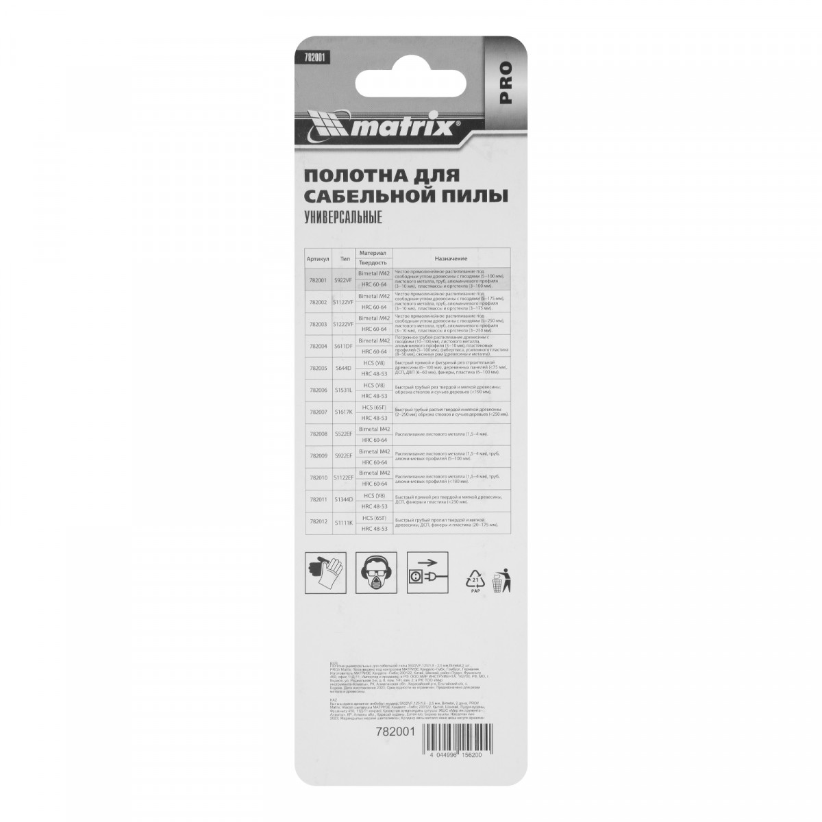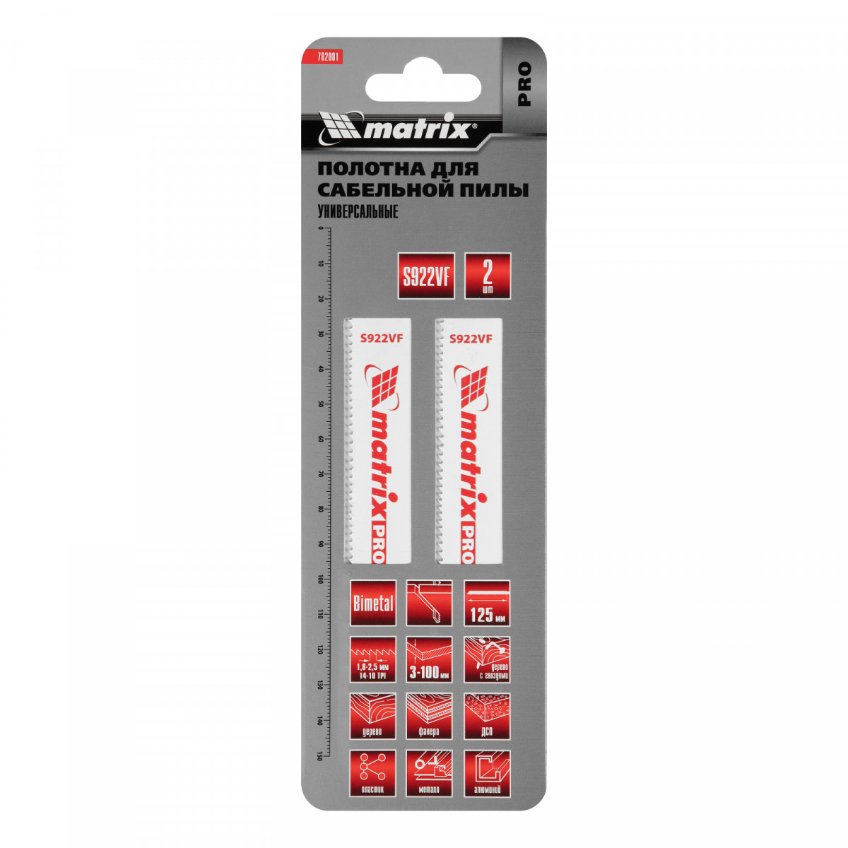 Универсальные полотна для сабельной пилы S922VF Matrix PRO 782001 с переменным шагом зубьев 1,8-2,5 мм, биметаллические (Bimetal), 2 шт. в упаковке, имеют рабочую длину 125 мм и позволяют быстро и качественно распиливать заготовки из древесины, пластика, листового металла, фанеры, ДСП, справляются также с алюминиевыми профилями и древесиной с гвоздями. В зависимости от материала глубина распила составляет от 3 до 100 мм. Полотна пригодятся на строительной площадке, во время ремонта, демонтажа различных конструкций, будут полезны дома и на даче.