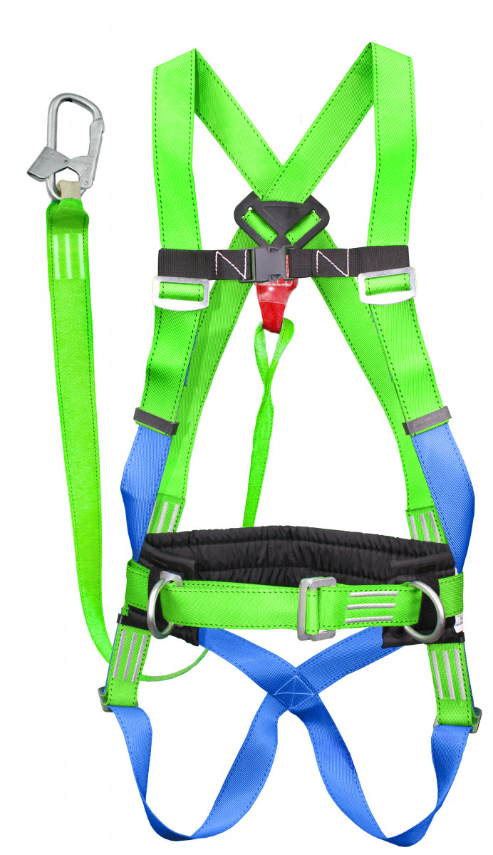 Пояс включает в себя ремень с пряжкой (позволяет подгонять пояс по фигуре человека), подкладку под ремень (кушак), наплечные и набедренными лямки, элементы крепления – два металлические D-кольца на ремне привязи и одно на спине, строп из полиамидной ленты с монтажным карабином (4 типа карабинов) и амортизатором (соединен неразъемным способом крепления и предназначен для снижения усилия торможения при падении), бирку, выполненную в соответствии с ГОСТ Р ЕН 365, паспорт-инструкцию с отметкой ОТК и гарантией производителя (закреплен под биркой на кушаке).