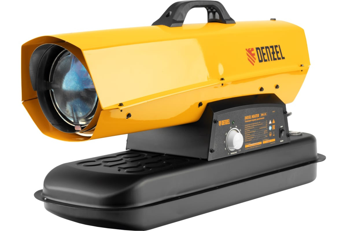 Дизельная тепловая пушка Denzel dhg-25i, 25 квт, 600 м3/ч, прямой нагрев, термостат 96483 номинальной тепловой мощностью 25 кВт и производительностью 600 куб. м/ч, с прямым типом нагрева, с электронным термостатом. Предназначена для обогрева цехов, складов, теплиц и других нежилых помещений. Используется в строительстве и на производстве. Пушка характеризуется низким расходом топлива: полного бака хватает на 10 часов работы. Важно: в обогреваемом помещении необходимо обеспечить хорошую вентиляцию.