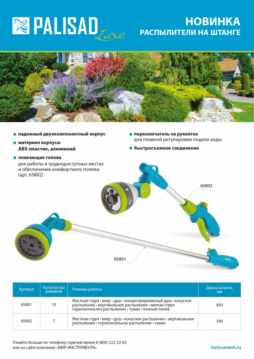 Распылитель Palisad Luxe 65802 на алюминиевой штанге длиной 500 мм, с 7 режимами работы и поворотной головой, подходит для орошения участков большой площади и растений в цветочных горшках, а также для очистки удаленных и труднодоступных мест. Расход воды можно плавно регулировать одной рукой, что облегчает решение поставленных задач.