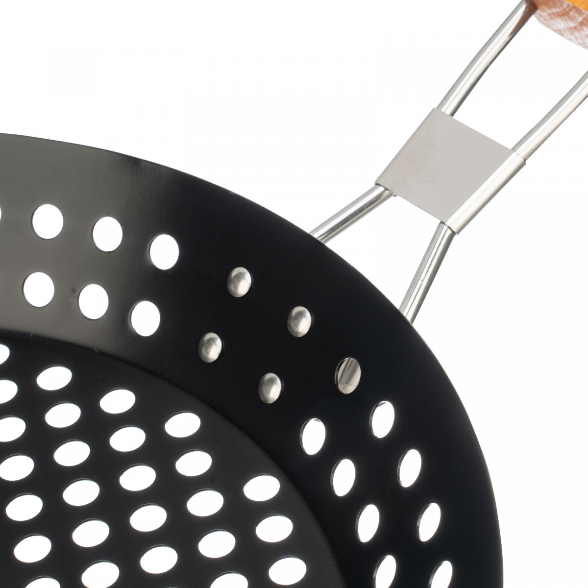 Решетка-жаровня Palisad Camping 69563 размером 530 х 305 х 40 мм позволяет приготовить на углях мелко нарезанные овощи и кусочки мяса, а также морепродукты. В большой жаровне можно пожарить за один раз несколько порций еды на целую компанию.