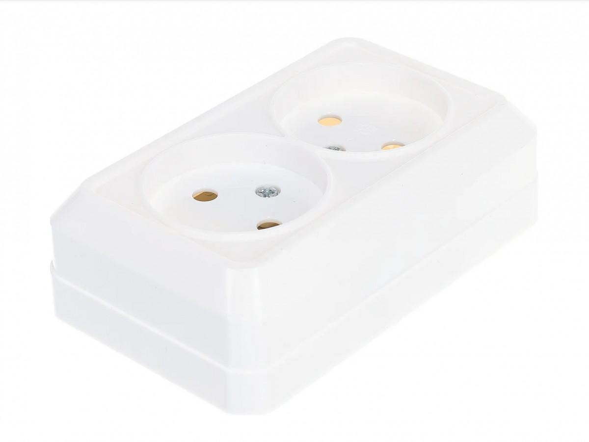 Двойная розетка без заземления, белая выполнена из АБС-пластика, имеет белый цвет корпуса.