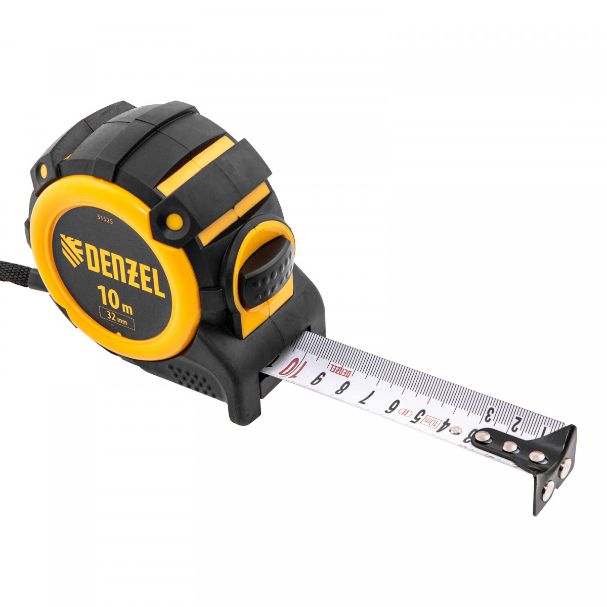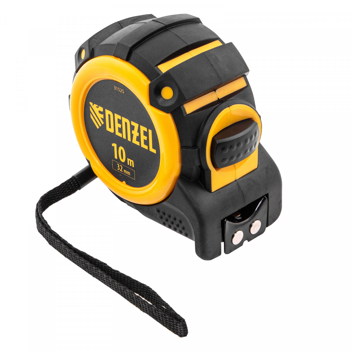 Рулетка 10м х 32мм, автоматич. фиксац., нейлон. покрытие, магнит. зацеп, двухстор. разметка Denzel