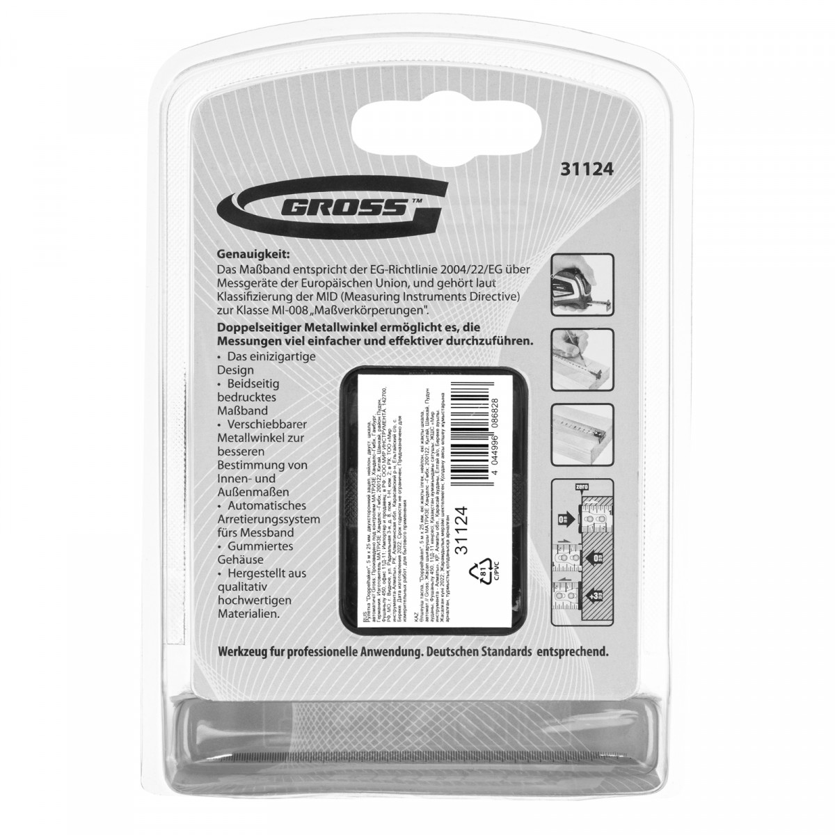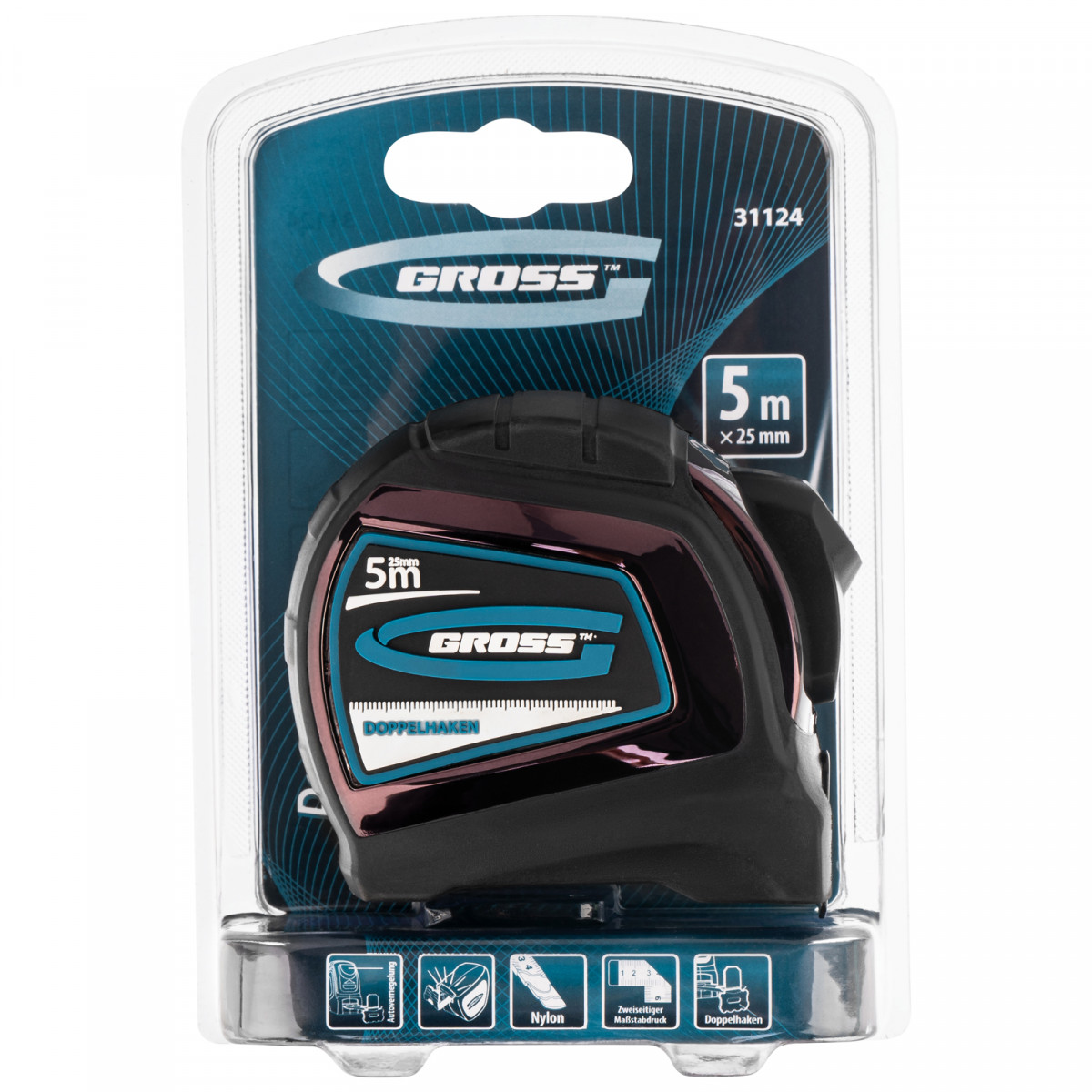 Рулетка "Doppelhaken",5 м x 25 мм,двухсторонний зацеп,Нейлон,двусторонняя шкала,автоматическая фиксация Gross